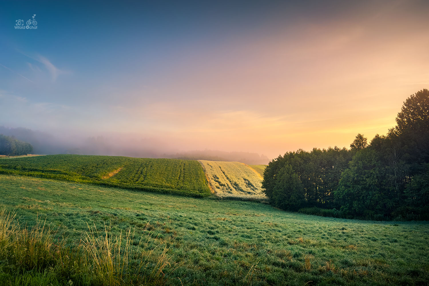 Zjeżdżam z górki na dół, gdzie panują mgły. Wjeżdżam w lokalną dróżkę i na dzień dobry mam widok, przy którym czuję, że wjechałem do innego świata. Ten rozproszony, a jednak ciągle oślepiający blask daje po oczach. Kawałek dalej mgła gęstnieje i słońcu nie udaje się już przez nią przebić. Kilkaset metrów i już zupełnie inna bajka.