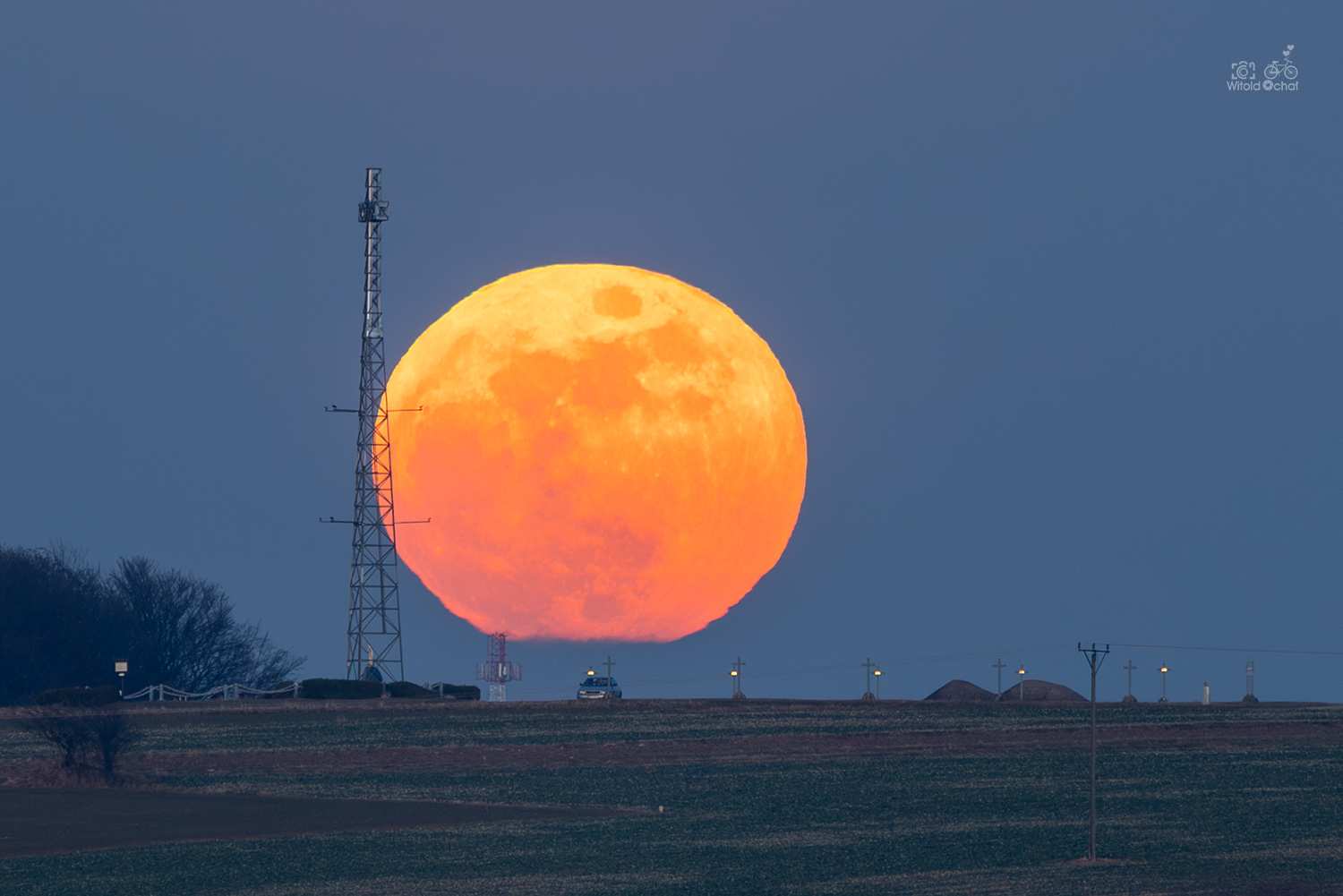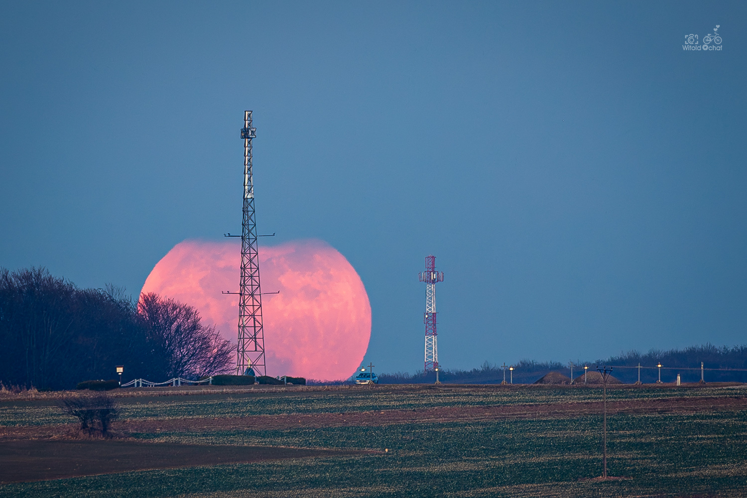 Jest tu nieopodal na wzniesieniu duży żelazny krzyż i z mojej miejscówki to właśnie za nim miał wzejść Księżyc. A że oddalony byłem od krzyża sporo, Księżyc miał się wydawać na zdjęciu mega duży. Przy takich ujęciach najbardziej fascynuje mnie kompresja perspektywy. Długa ogniskowa robi z odległych planów jedną zwartą historię.