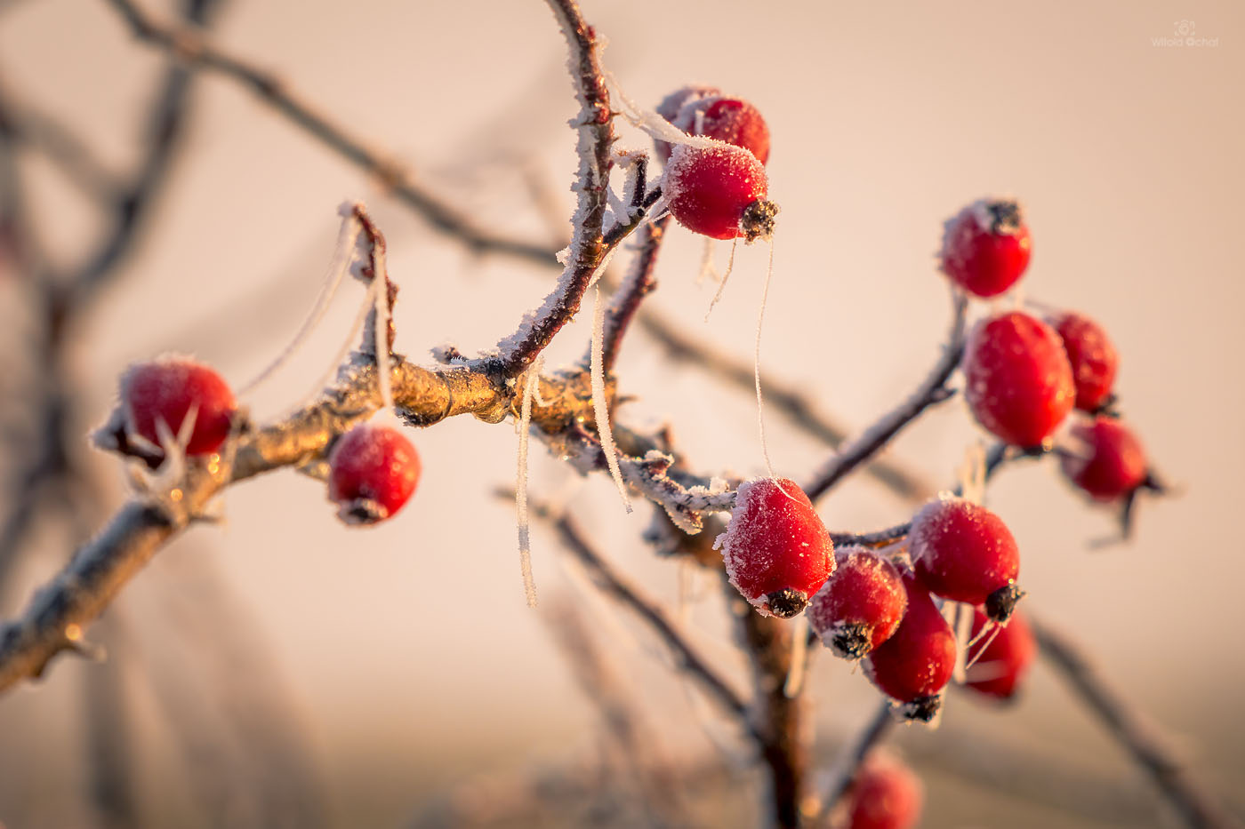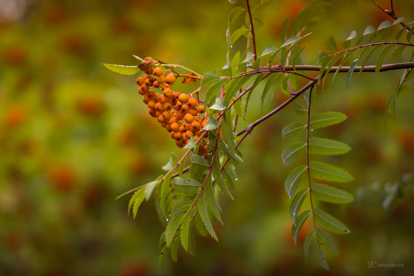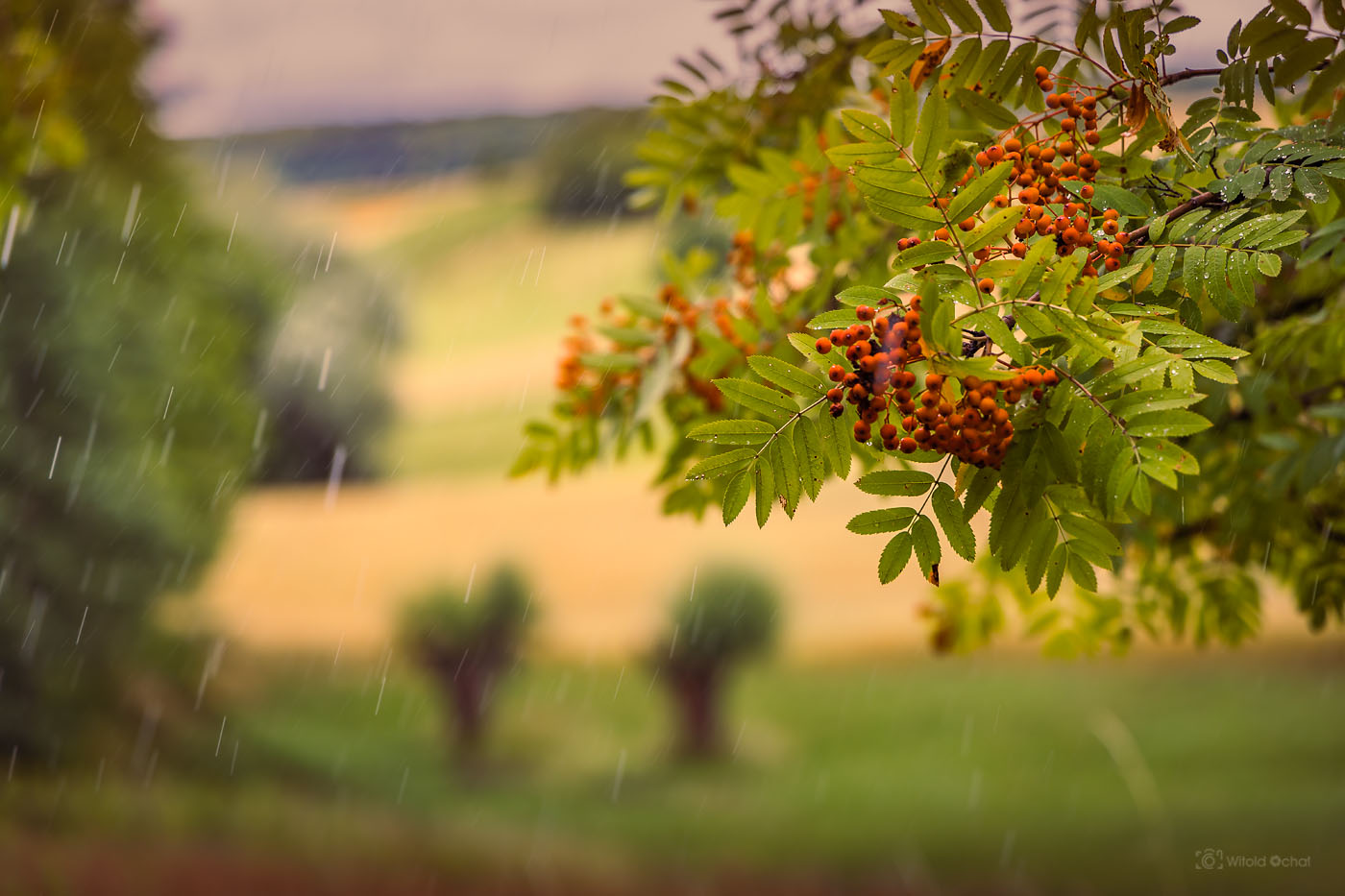 Oczywista sprawa, że wybiorę się tam jeszcze własnie któregoś wieczoru, kiedy owoce będą już czerwieniutkie. Tymczasem również podczas niedzielnego rekonesansu udało się złapać kilka kadrów, w tym jedno z padającym deszczem. A lunęło znienacka, kiedy akurat robiłem jedno ze zdjęć. W sumie fajnie wyszło z tym smugami kropli 🙂