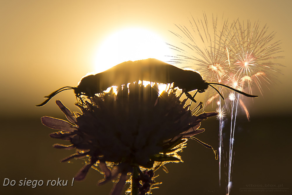 Dwa kraśniki pięcioplamki postanowiły spędzić sylwestrowe popołudnie na jednym z nielicznych pozostałych polnym kwiatku. Były tak zajęte sobą, że nie zauważyły nawet fajerwerków, które ktoś wystrzelił tuż za ich plecami.