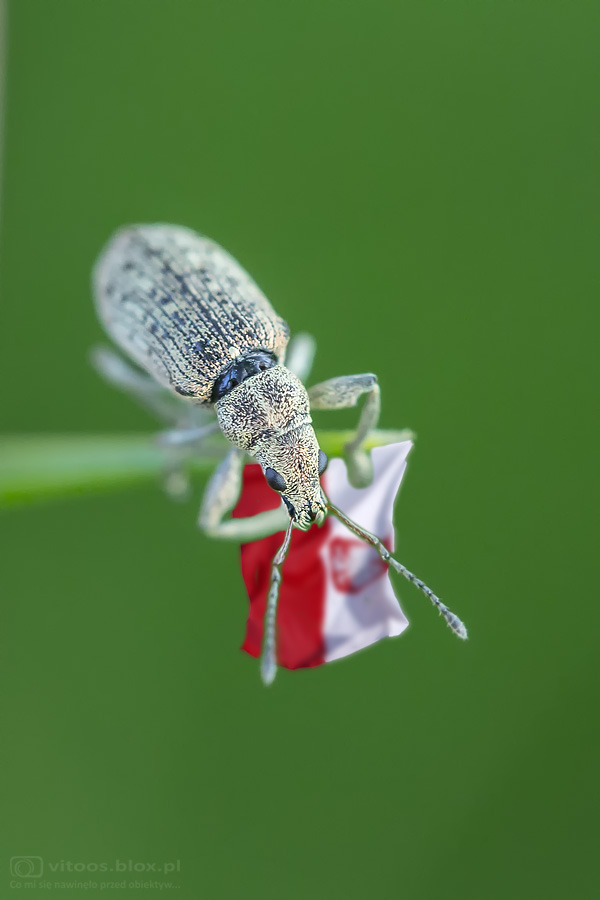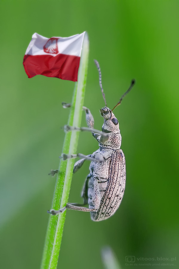 Wczoraj rankiem wyszedłem na moją dziką część ogrodu, na której w tym roku postanowiłem nie kosić trawy. Tak jak przypuszczałem, w trawie napotkałem mnóstwo owadów. Jedno miejsce pod brzozą szczególnie upodobały sobie chrząszcze. Jakież było moje zdziwienie, kiedy zauważyłem, jak jeden z chrząszczy wspina się na trawę i… wiesza na niej flagę! No tak, wczoraj było święto flagi. Pamiętał.