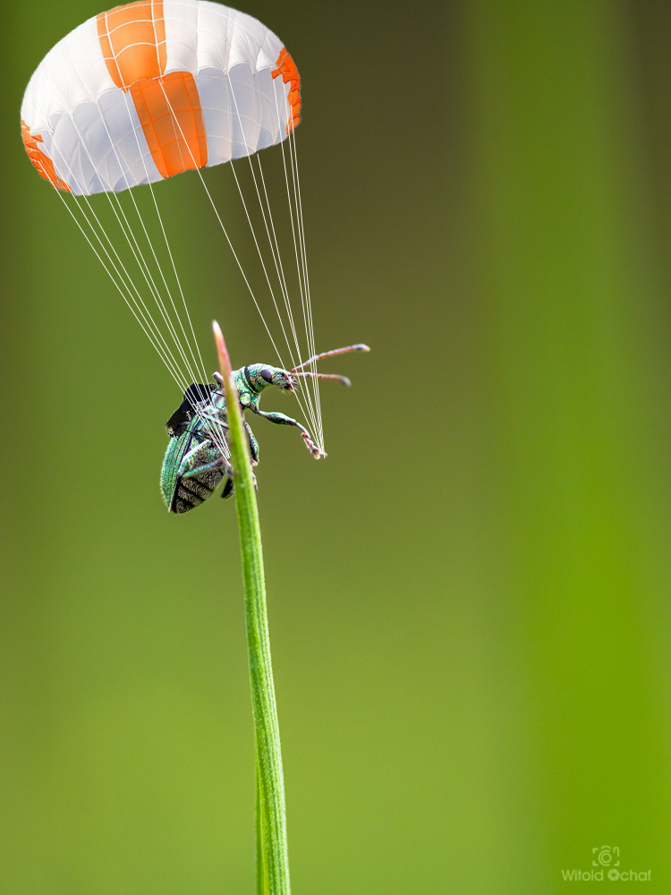 To wyglądało dosyć dramatycznie. Chrząszcz lubiący sporty ekstremalne koniecznie chciał spróbować skoku na spadochronie. Poprosił jaskółkę, żeby wyniosła go hen wysoko w niebo, po czym zeskoczył jej z grzbietu. Okazało się jednak, że wybrał za mały spadochron i leciał w dół jak przecinek. Wyrżnął by w glebę, ale w ostatniej chwili złapał się wystającej trawki, a ja uchwyciłem ten moment 🙂