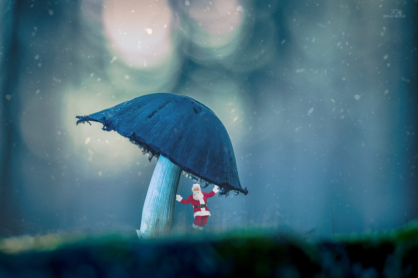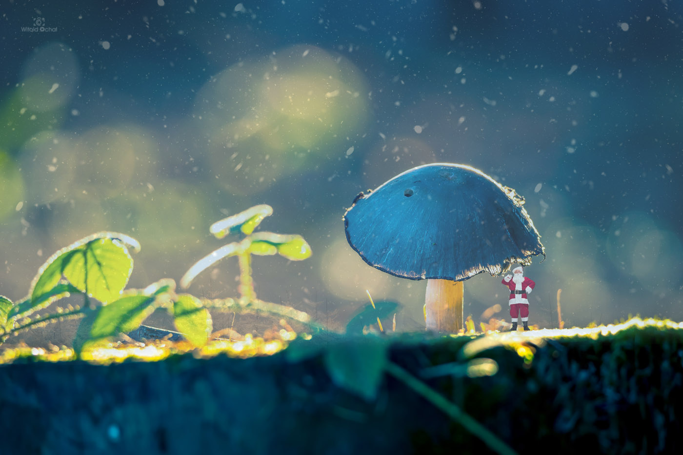 Zacząłem go więc fotografować, kiedy zza trzonka wyszedł mikroskopijny Mikołaj z workiem i zaczął robić różne pozy! Przecierałem oczy ze zdumienia, ale niczym profesjonalny fotograf niewzruszony fotografowałem dalej. Podszedłem potem do tego grzyba, aby zamienić kilka słów i wysępić jakowyś prezent, ale Mikołaj zniknął…