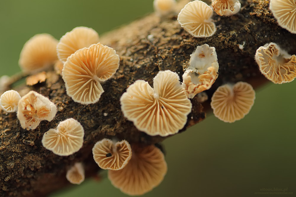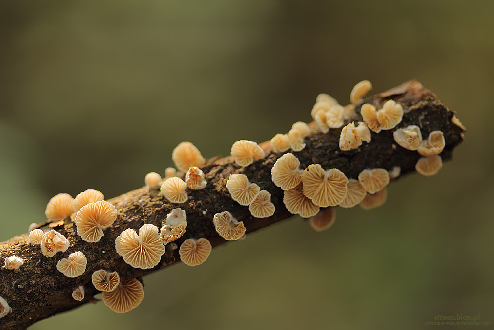 Kilka dni temu wybrałem się na poszukiwanie oznak wiosny. Było ich nie za wiele, ale za to na jednej z gałęzi, przez którą zresztą o mało nie miałem niekontrolowanego kontaktu z glebą, zauważyłem dużą ilość malutkich grzybków, które skojarzyły mi się z małymi muszelkami.