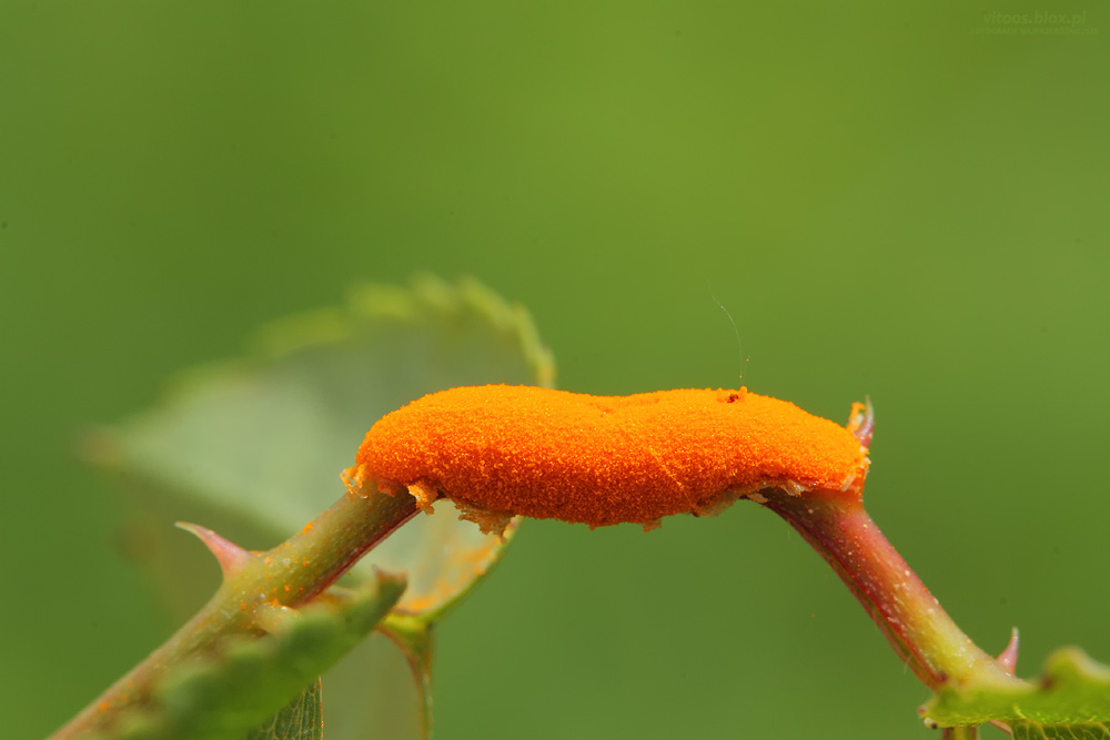 Nieopodal na gałązce dzikiej róży zauważyłem innego pasożyta, tym razem w jaskrawym kolorze.