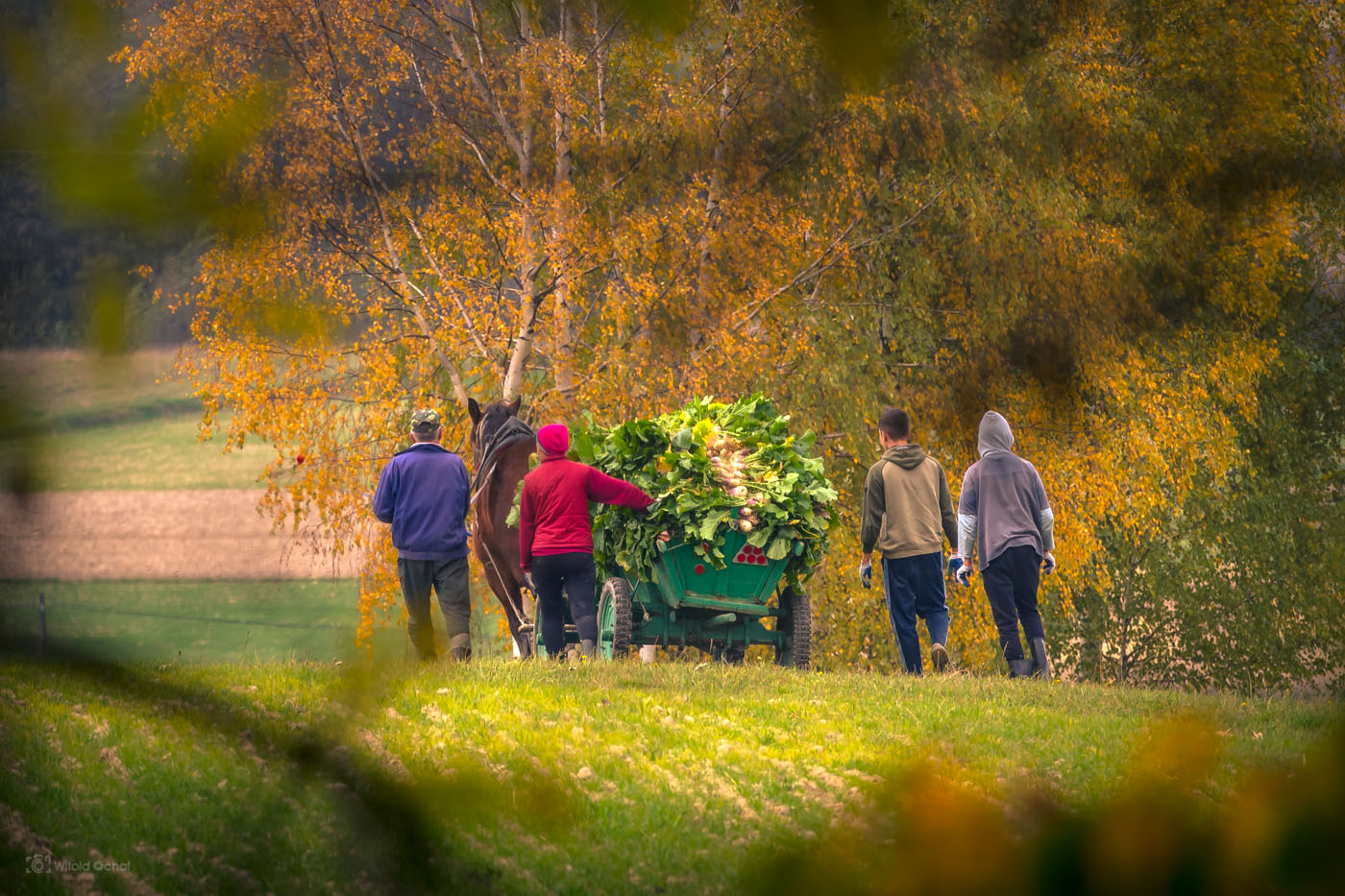 Jesień potrafi zaskoczyć nie tylko kolorem liści, ale i tym, kogo można spotkać na polnej drodze. Jadę sobie spokojnie rowerem, a tu przede mną ekipa jak z dawnego podręcznika do przyrody – ludzie, koń i wóz wypchany zielonym dobrem.