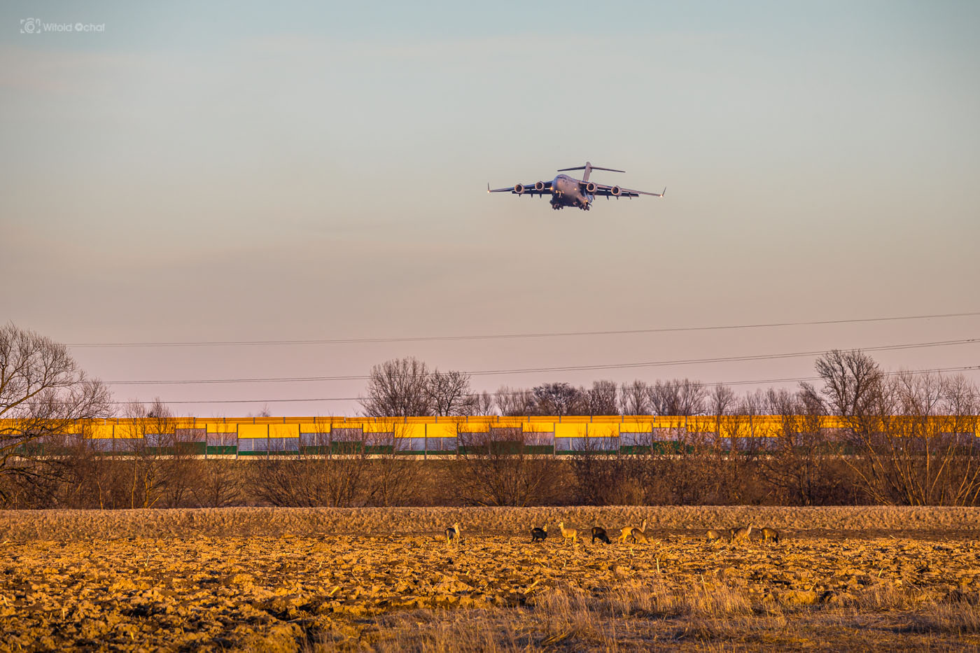 W niedzielę będąc przejazdem w okolicy lotniska w Jasionce postanowiłem poczekać między innymi na przylatującego C-17. Na polu pod lotniskiem zauważyłem stadko saren. Nie zważając, że buty miałem „kościołowe” 🙂 pobiegłem w orankę, aby ustawić się tak, by złapać sarenki razem z Globemasterem. Miałem szczęście, że nie wystraszyły się ani mnie, ani podchodzącej do lądowania maszyny. Nie ma się co zresztą co dziwić, to dla nich pewnie codzienność. I lądujące samoloty i chłopy z lufami.