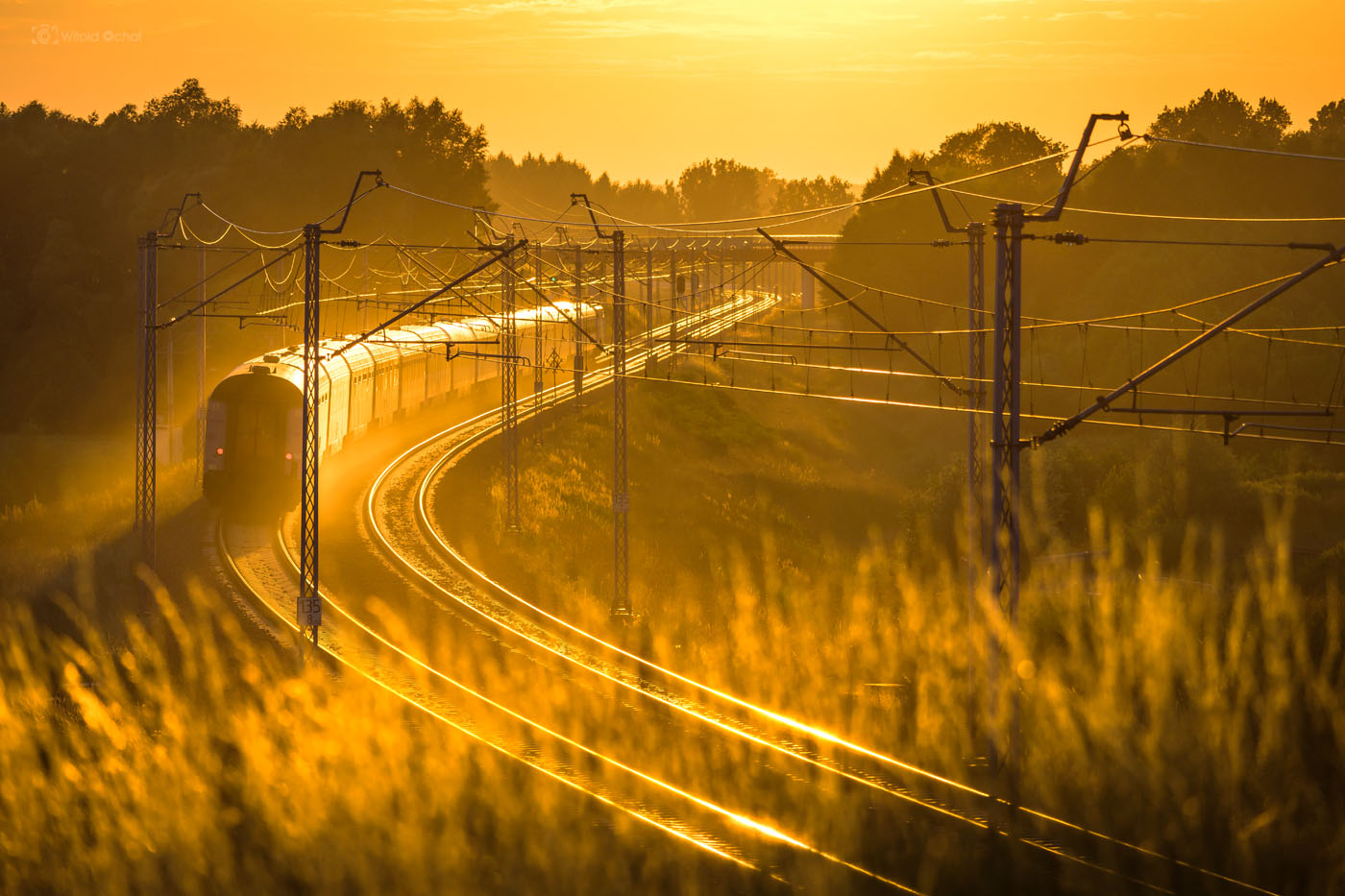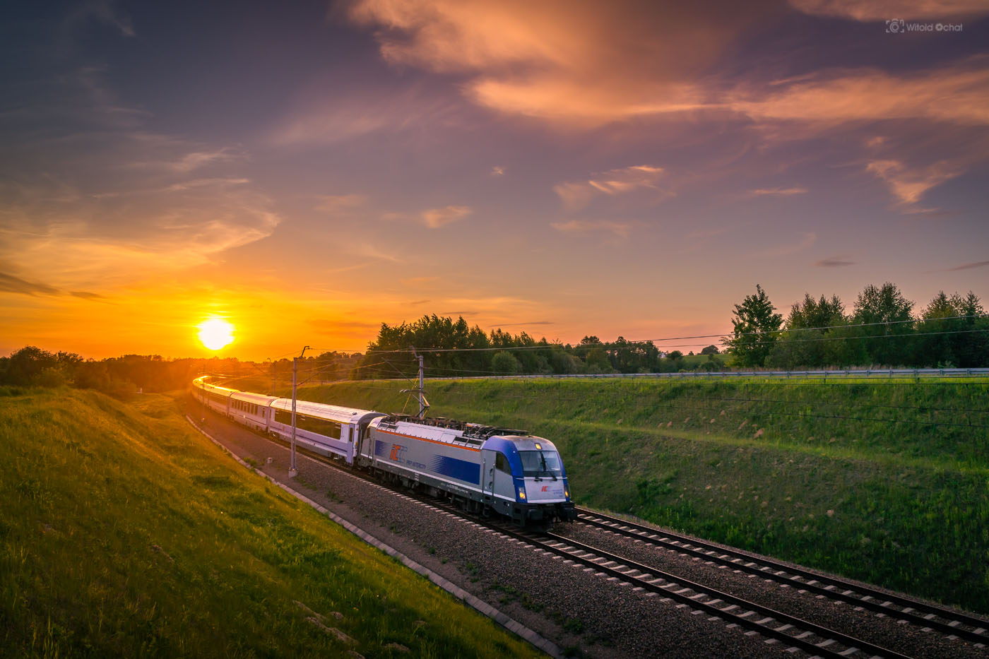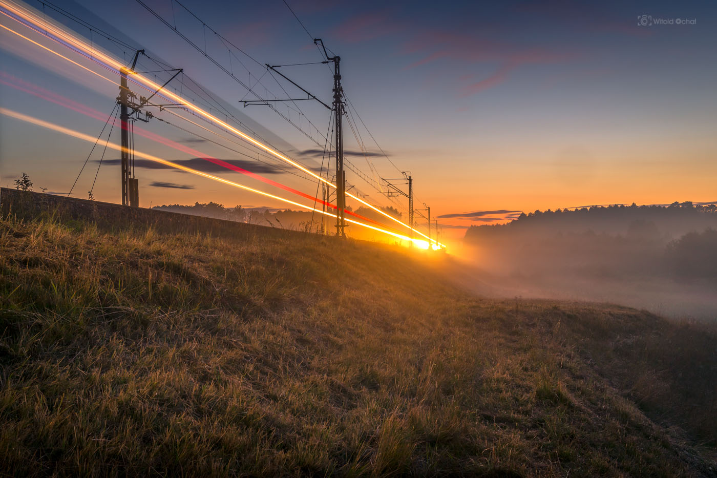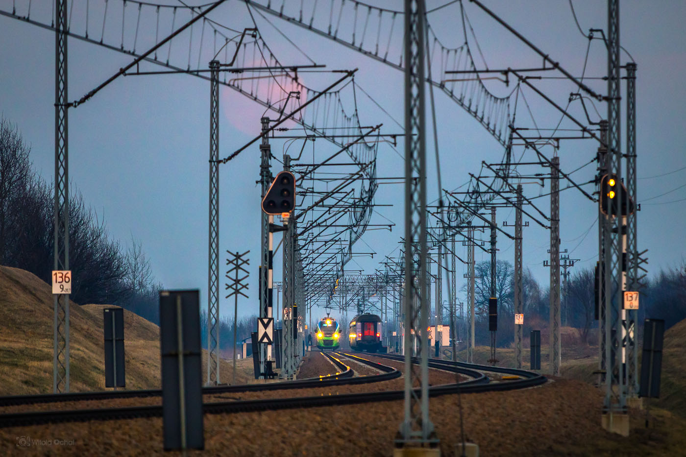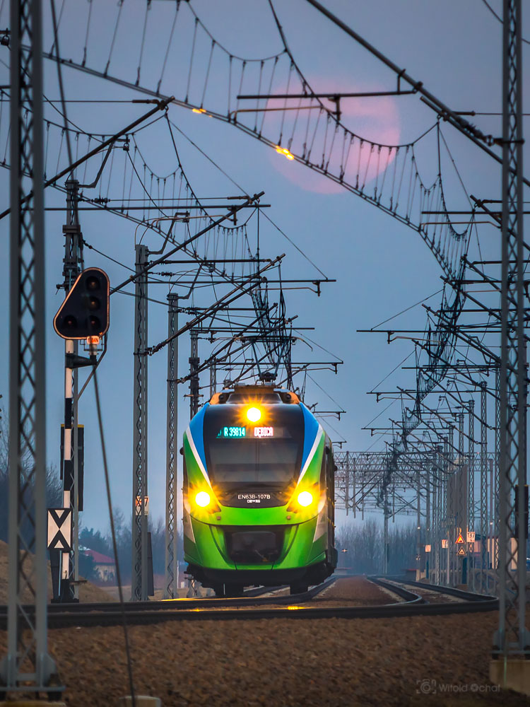 Tego wieczoru było podobnie. Na niebie działa się już magia, a pociąg nie nadjeżdżał. A ja stałem, przebierałem nóżkami i prawie zniosłem jajko. Aż w końcu nadjechał i oto mamy ten klimatyczny kolejowy obrazek 😉