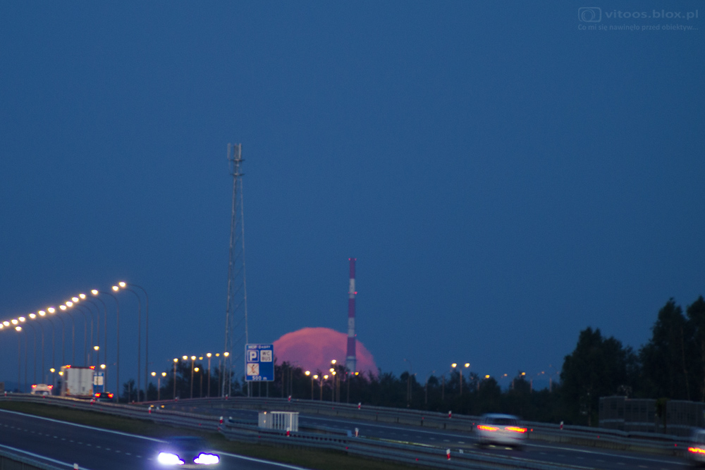 W ubiegły wtorek po raz kolejny, już teraz nie pamiętam który, polowałem z aparatem na wschodzący księżyc. Tym razem zupełnie przypadkiem trafiłem w miejsce, gdzie księżyc wschodził dokładnie nad wysokim kominem pobliskiej elektrociepłowni. Odległość od mojej miejscówki do komina wysokiego na 200 metrów wynosiła w linii prostej około 16 kilometrów. Jak widać z tej perspektywy, komin był tak duży jak ów komin 😉