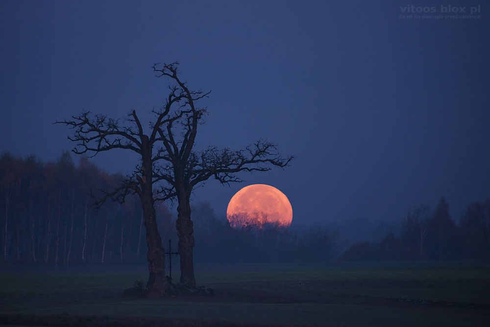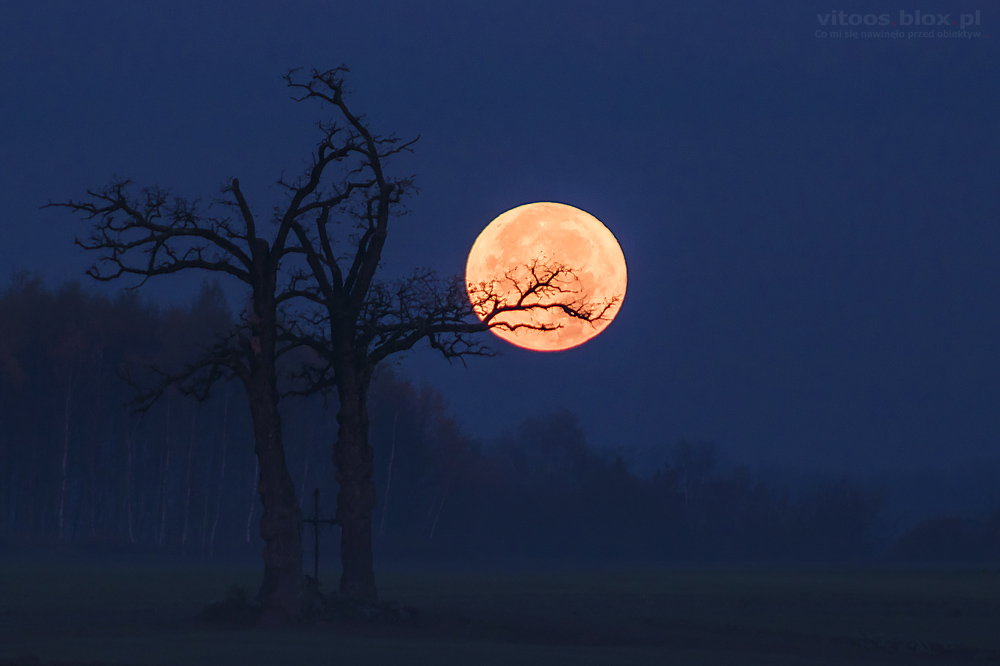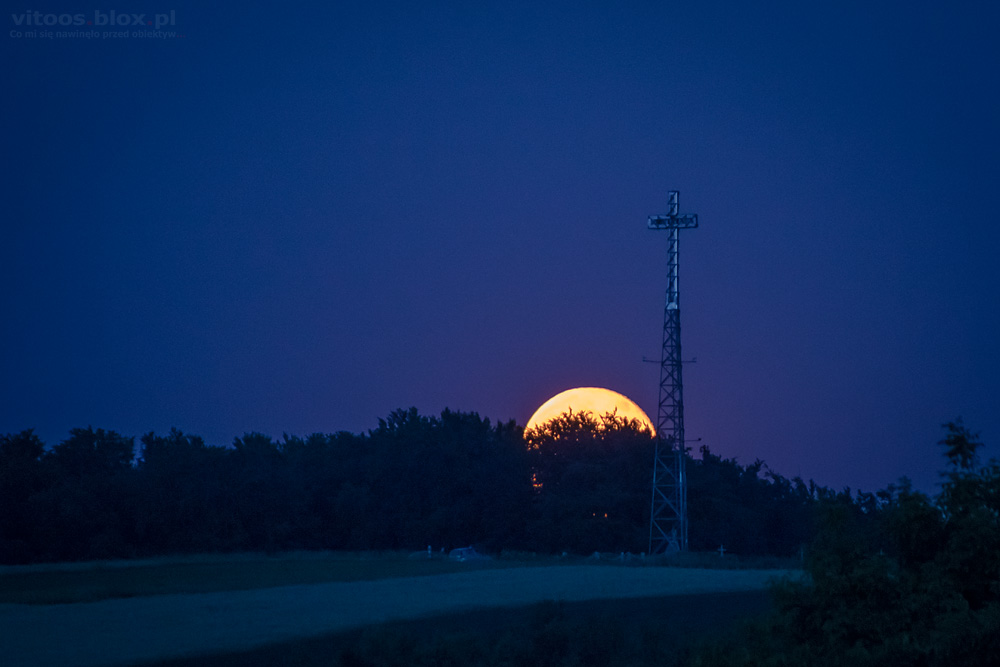 Na taki układ czekałem ponad rok. Chciałem sfotografować wschodzący Księżyc dokładnie na tle wysokiego krzyża znajdującego się na pobliskim wzgórzu. Zrobiłem to co prawda już miesiąc temu, ale z dużo bliższej odległości. Tym razem fotografowałem z dużo większej odległości.