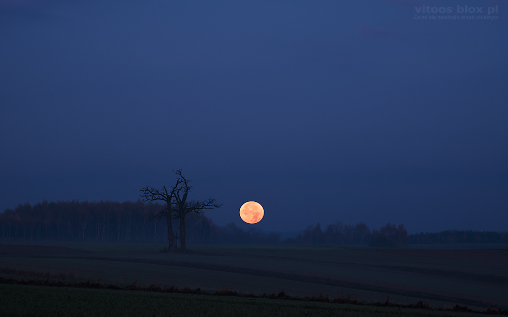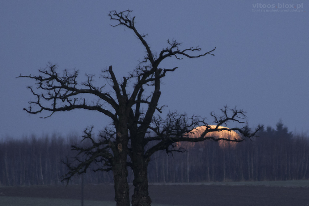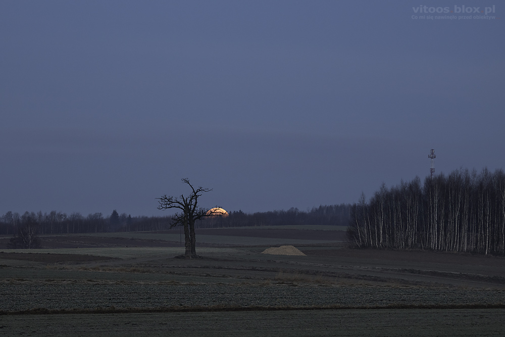 W sobotę nie tylko rano warunki sprzyjały fotografowaniu księżyca. Podobnie było wieczorem podczas wschodu naszego satelity. Co prawda było już dosyć ciemno, ale używając wysokich wartości ISO udało się zrobić kilka zdjęć, ale już w zupełnie innych okolicznościach przyrody.
