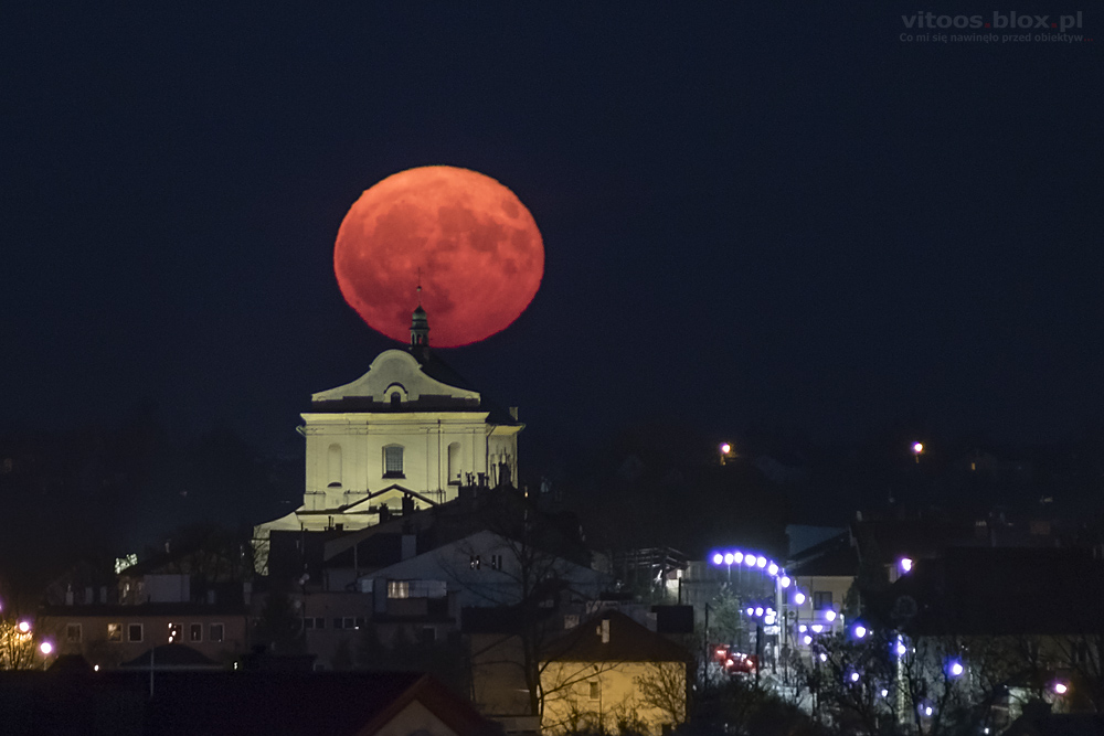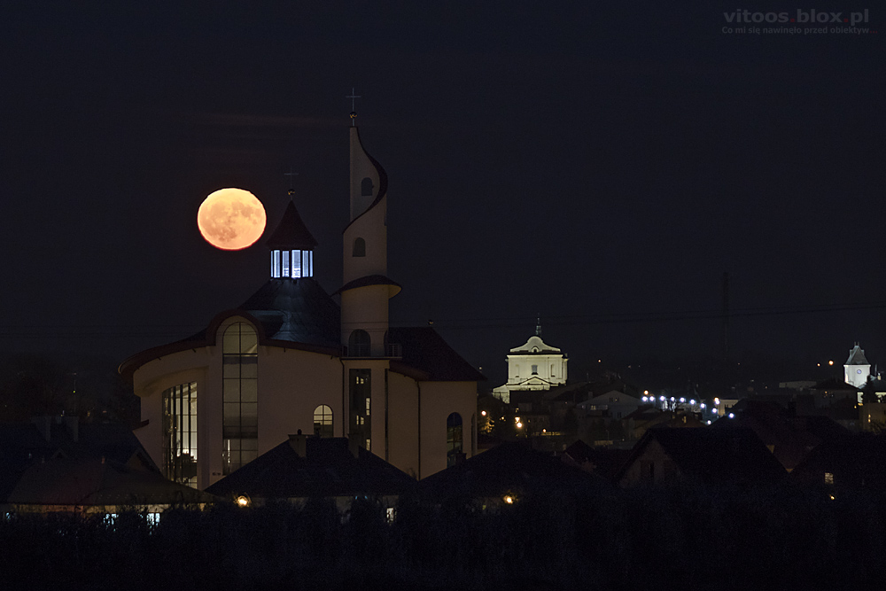 FOT. WITOLD OCHAŁ POWIAT ROPCZYCKO-SĘDZISZOWSKI SĘDZISZÓW MAŁOPOLSKI WSCHÓD KSIĘŻYCA NAD KOŚCIOŁEM PARAFIALNYM ZOOM ZBLIŻENIE NA DŁUGIEJ OGNISKOWEJ KSIĘŻYC SREBRNY GLOB