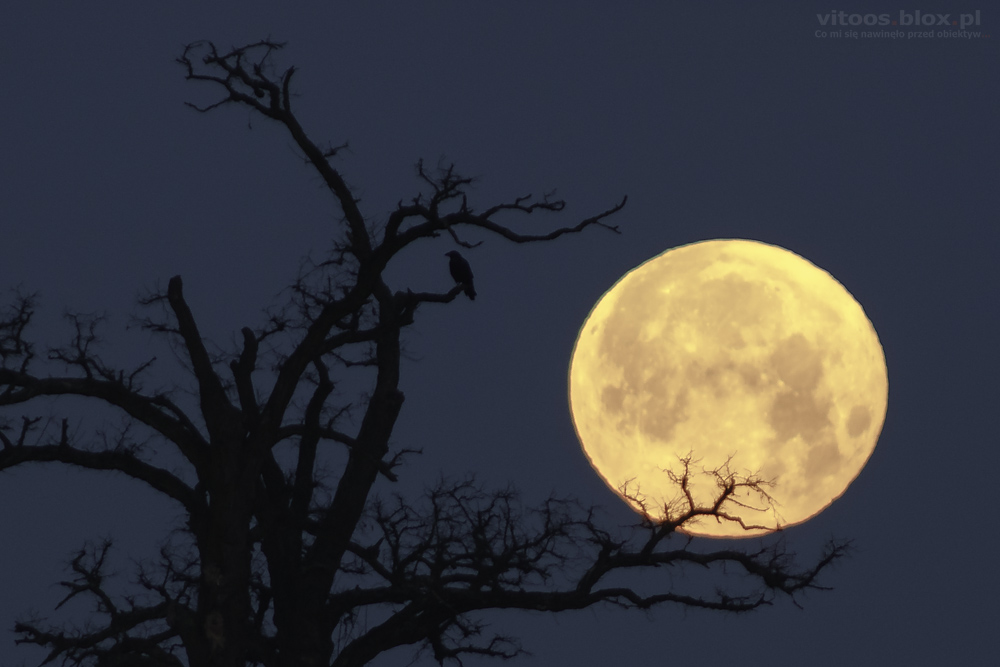 Pierwsze zdjęcie mogłoby być hitem, ale dopiero w domu na monitorze zobaczyłem, że obok księżyca na gałęzi siedział gawron. Wystarczyło by przesunąć się z aparatem lekko w lewo i gawron byłby w tarczy księżyca