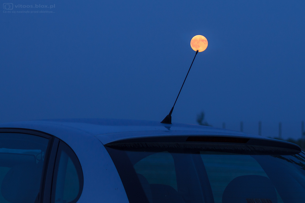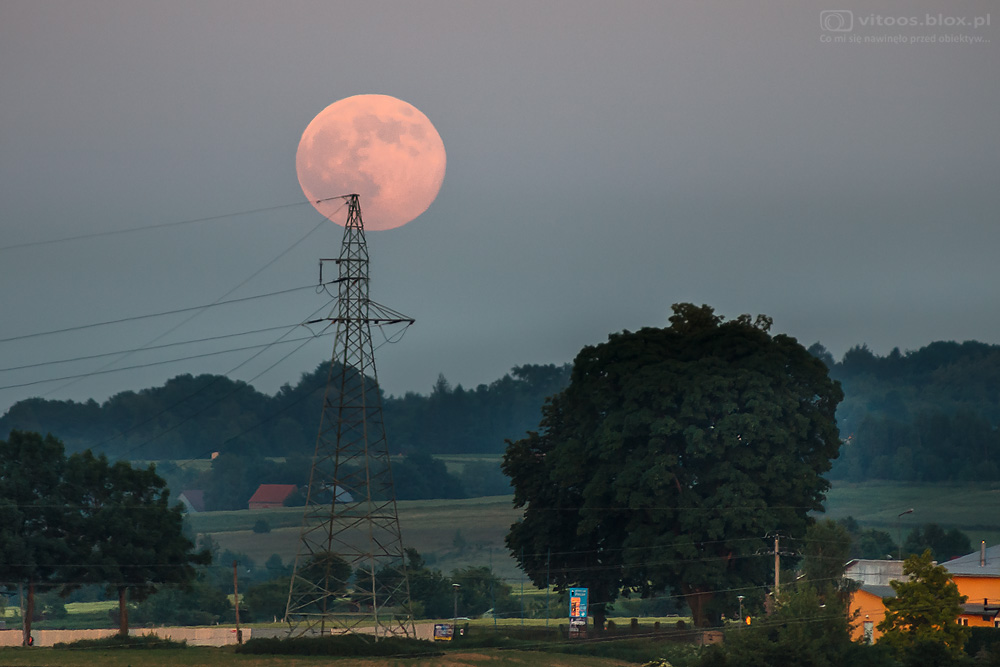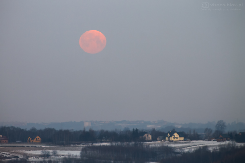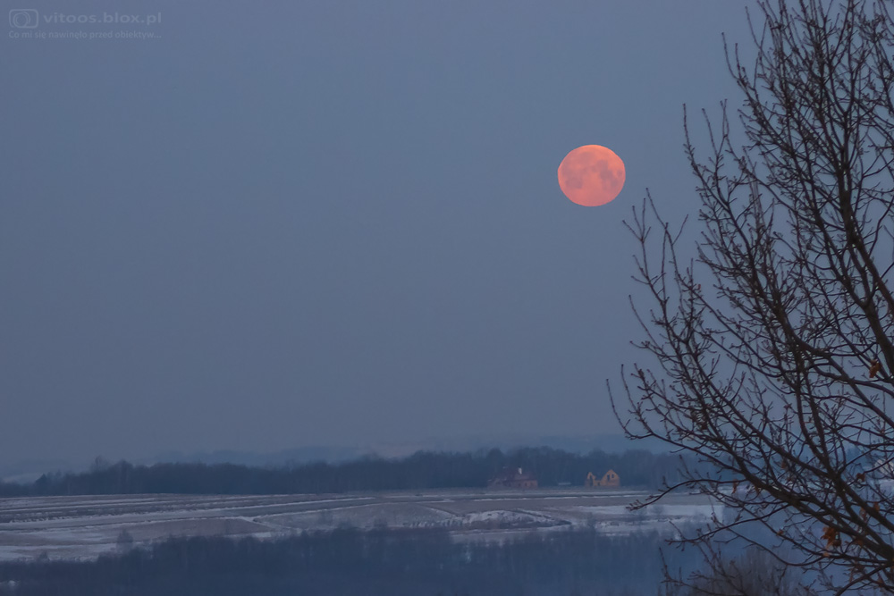 Kolejny raz udało mi się sfotografować wschodzący księżyc w pełni. Po kilku dniach kiepskiej pogody niebo nareszcie zrobiło się czyste. Tym razem nie szukałem żadnej ciekawej miejscówki, tylko po prostu wyszedłem na najbliższą górkę i czekałem na widowisko.