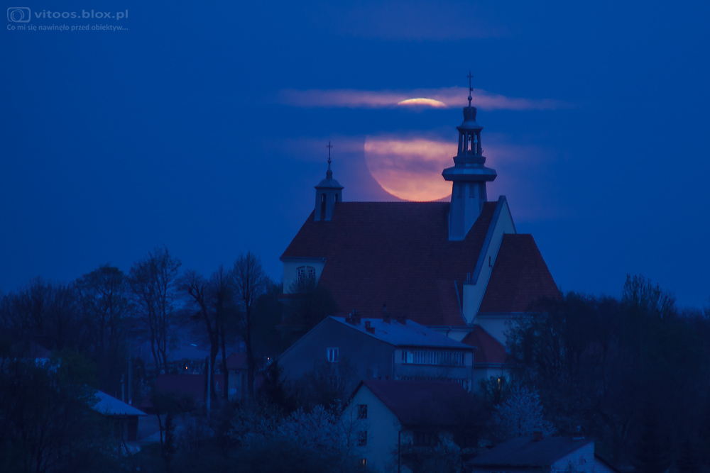 Taki kadr marzył mi się od dawna. Dzisiaj mimo niesprzyjającej pogody postanowiłem się udać na wybrane miejsce i w końcu się udało. Było trochę chmur, ale w decydującym momencie rozstąpiły się i Księżyc ukazał się w pełniej krasie.