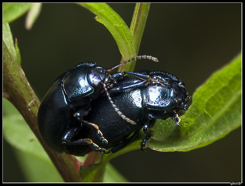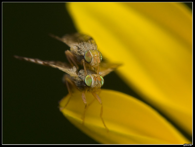 Kiedy zobaczyłem tę muszkę na Chwastowisku Warszawskim, zaraz mi się przypomniało, że też ją kilka dni temu sfotografowałem. Dwa osobniki Gymnosoma sp. oddawały się miłosnym uniesieniom, kryjąc się za pajęczynami. Samiec czule obejmował swoja lubą za oczy, a onanie obejmowała go niczym, bo musiała dźwigać jego ciężar na plecach…
