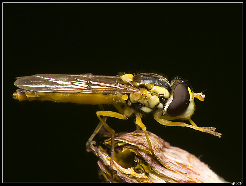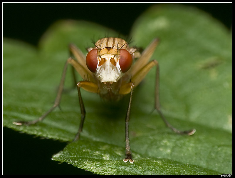 Tak wracając do moich porannych eskapad, to zauważyłem, że wcale nie prawda, że owady rano są „nieruchawe”, przeciwnie, skaczą, latają, jakby miały owsiki co najmniej. Ta mucha była wyjątkiem. Nieraz jak zrobię kilka zdjęć trącam listek, aby owad przeniósł się gdzieś obok w inne otoczenie. Ta niczym się nie przejmowała, jak siedziała tak siedziała 😉