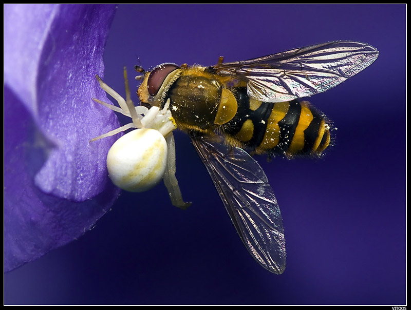 Przechadzając się z aparatem po ogródku natknąłem się na ciekawą scenkę. Malutki Kwietnik (Misumena vatia) sprytnie złapał większego od siebie bzyga i… już nie puścił…