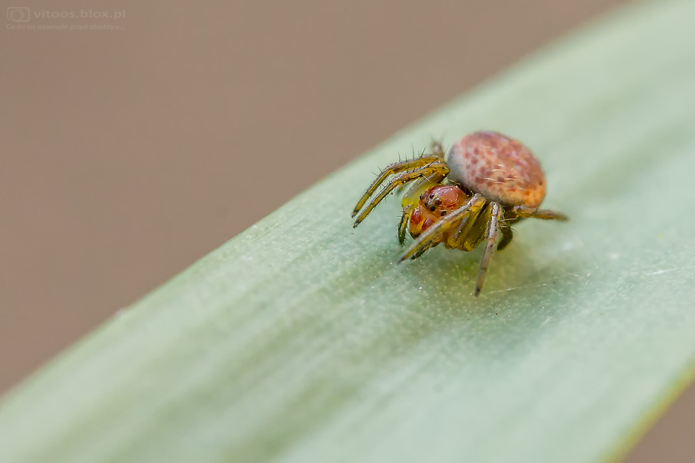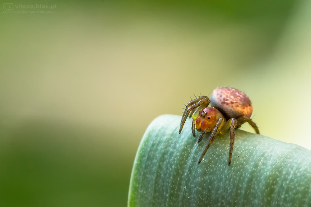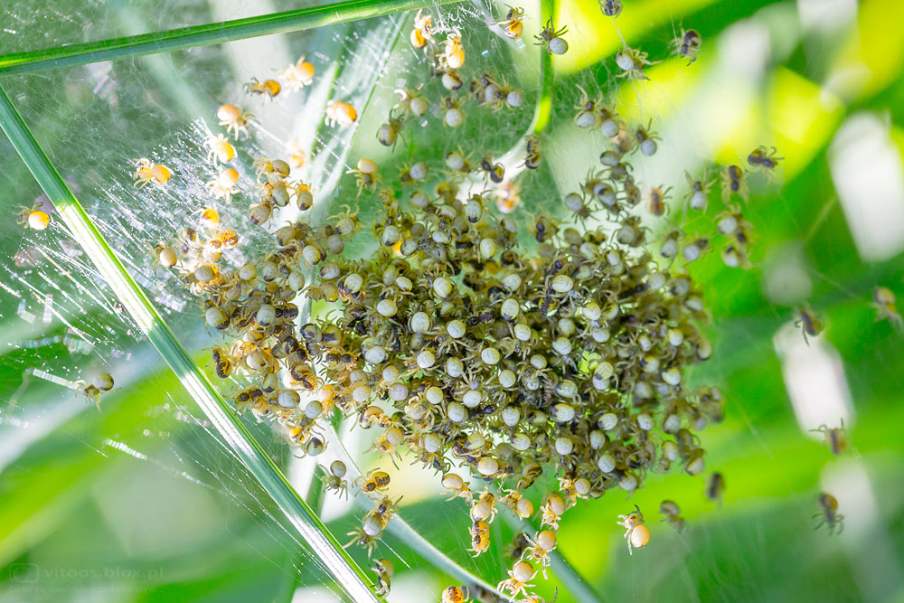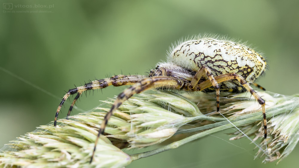 W sierpniu na łące królują oczywiście pająki. Ten tu siedział sobie na samotnie, a w pobliżu nie było żadnej pajęczyny. Być może wybrał się na spacer nieco dalej od swojego domu, albo po prostu pokonał go mocniejszy podmuch wiatru.