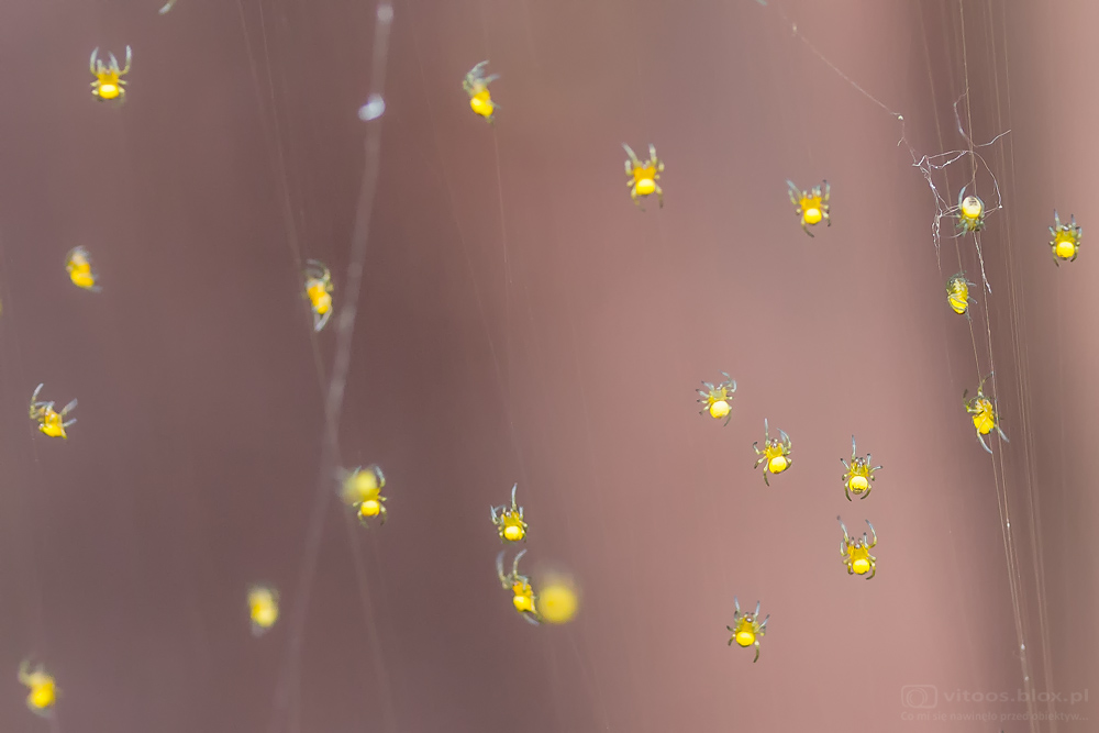 Na jednym z ogrodowych krzewów, zabijcie mnie, nazwy sobie teraz nie przypomnę, często mogę liczyć na obecność tych malutkich zielonych pajączków.