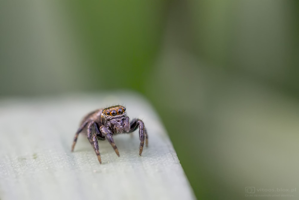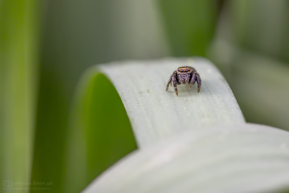 Pierwszy raz zobaczyłem go wczoraj przed południem. Siedział sobie na liściach narcyza. Jednak kiedy tylko się do niego zbliżyłem, spuścił się na pajęczynie na ziemię, a zaraz potem skoczył gdzieś na bok. Do wieczora kilka razy sprawdzałem, czy nie wrócił na swoją pozycję. Dopiero krótko przed zmierzchem udało się mi się go wypatrzeć po raz drugi. Tym razem nie ryzykowałem i zrobiłem zdjęcia z nieco dalsza.