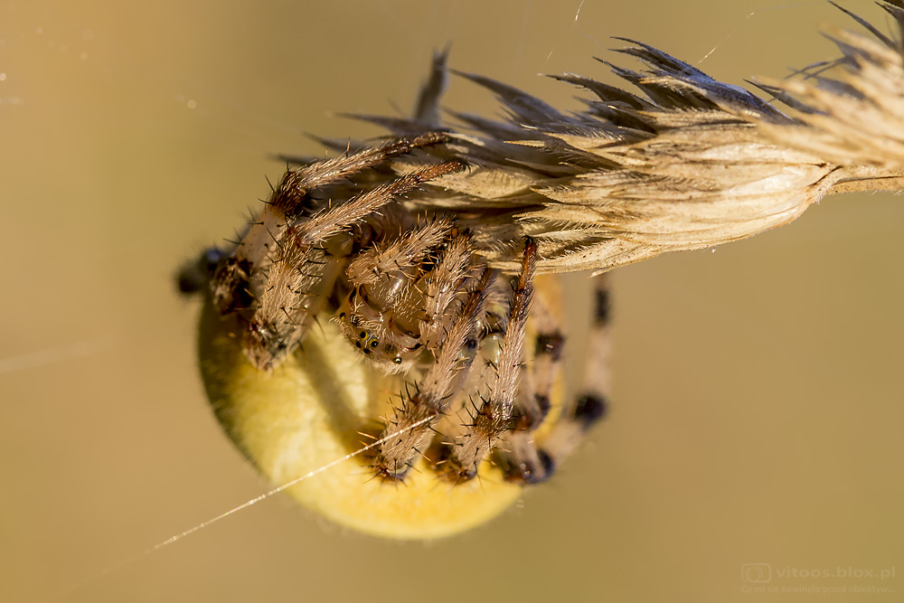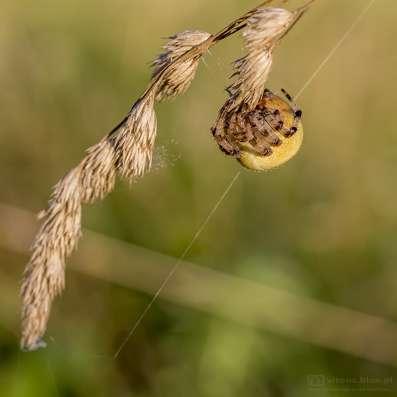 Siedziała sobie (albo siedział) na skraju pajęczyny zaczepionej o końcówkę długiej zeschniętej trawy. Pajęczyna pełna była zdobyczy, więc mogła spokojnie oddać się drzemce.