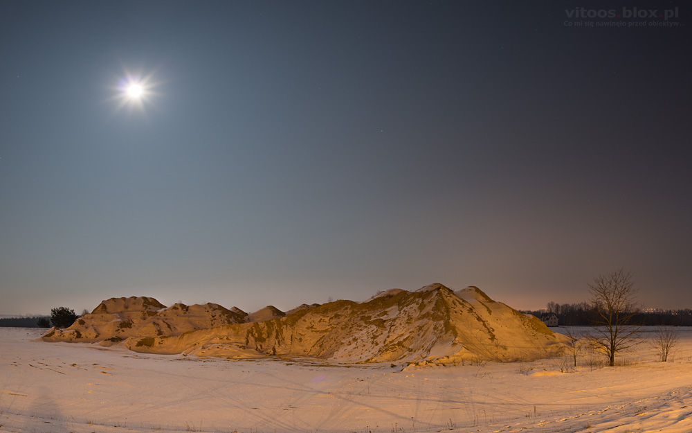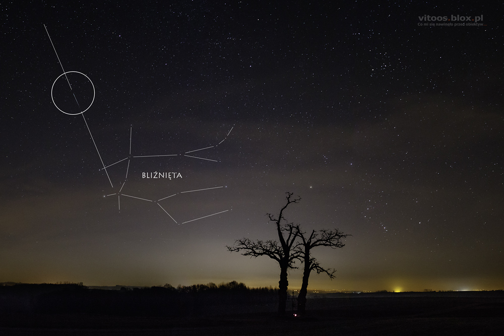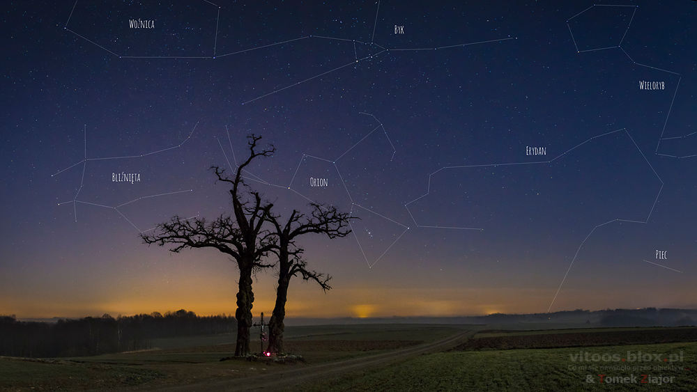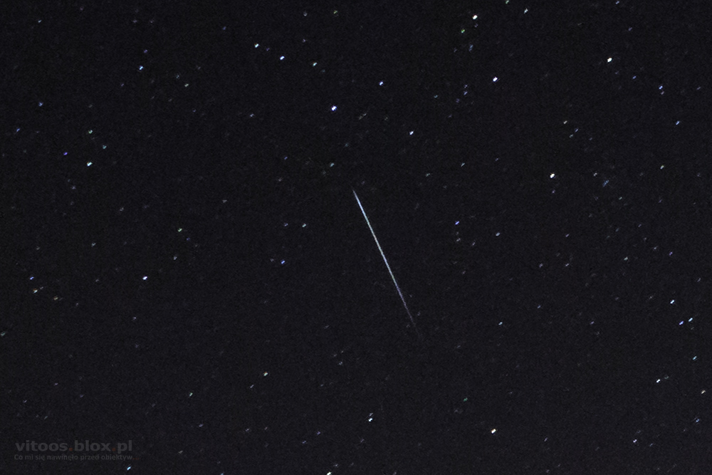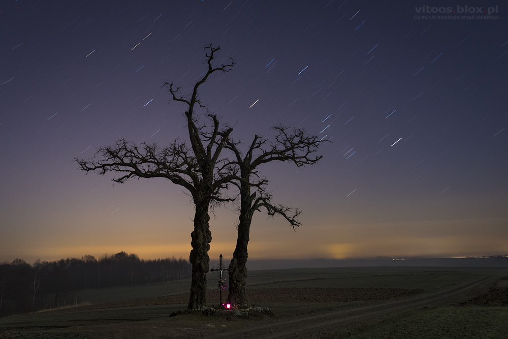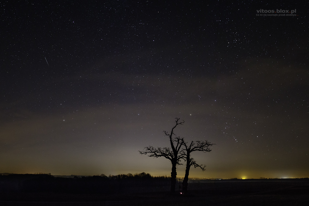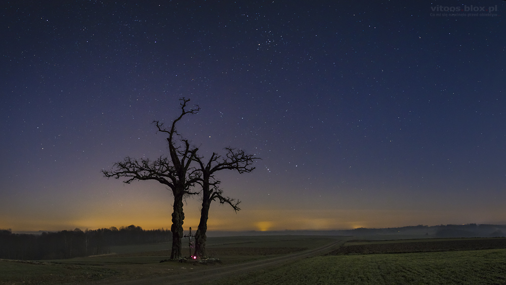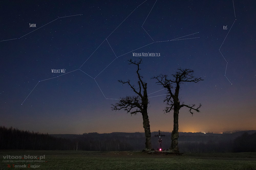 Wczoraj Tomek pokazał mi podobne zdjęcie i zaraz w głowach narodził nam się pomysł, żeby samemu spróbować takie zrobić. O tej porze roku Wielki Wóz znajduje się na niebie w dosyć karkołomnej pozycji, „stoi na dyszlu”. W planie było go „postawić” na czymś charakterystycznym w okolicy. Padło na jedno z najwyższych wzniesień w okolicy i znajdujący się tam trzydziestometrowy krzyż. I taki oto efekt.