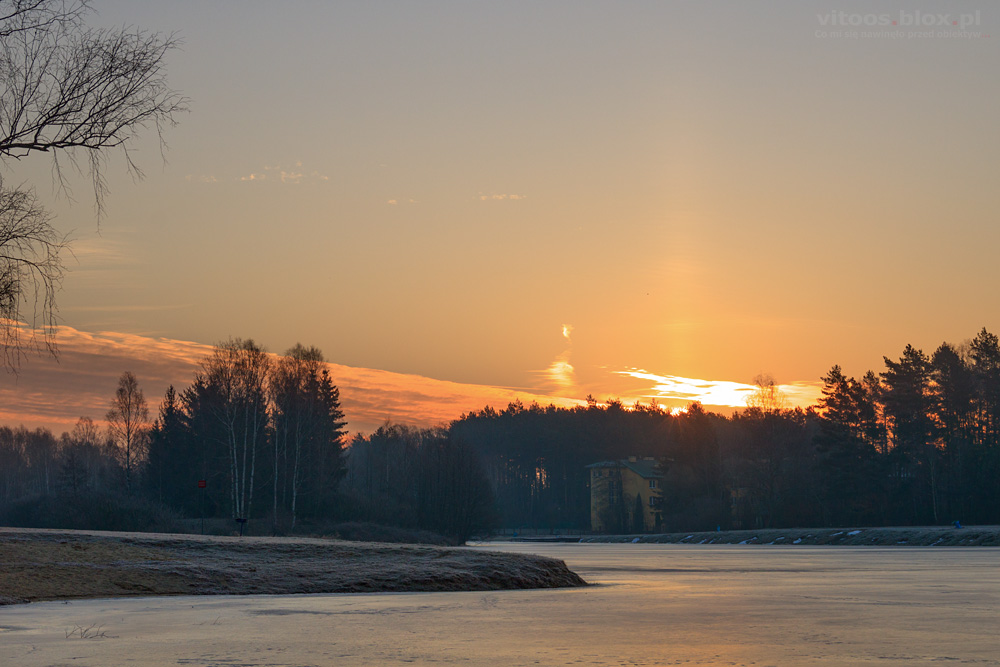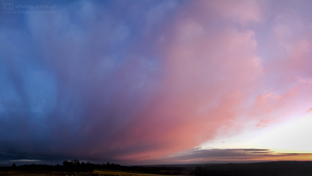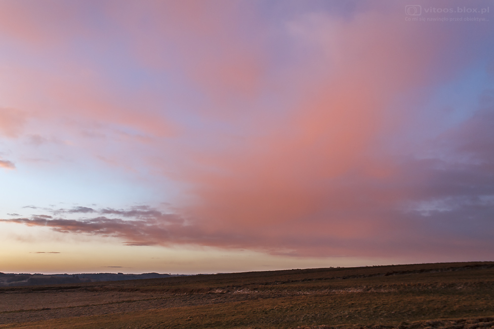 Jeśli wieczorem się nastawię, że rano trzeba wstać na zdjęcia, to z pobudką nie miewam większych problemów. Zupełnie inaczej jest, kiedy trzeba wstać do pracy. Wtedy kości jakieś takie zastanę, oczu nie mogę otworzyć i wszystko idzie mi jakoś tak ciężko. Dzisiaj rano na stanowisku byłem już grubo przed świtem. Na dzień dobry udało mi się sfotografować niewielką chmurę opadową podświetloną promieniami słońca, które było jeszcze za horyzontem. Później było już tylko piękniej, a nawet pojawiło się subtelne słońce poboczne (przedostatnie zdjęcie).
