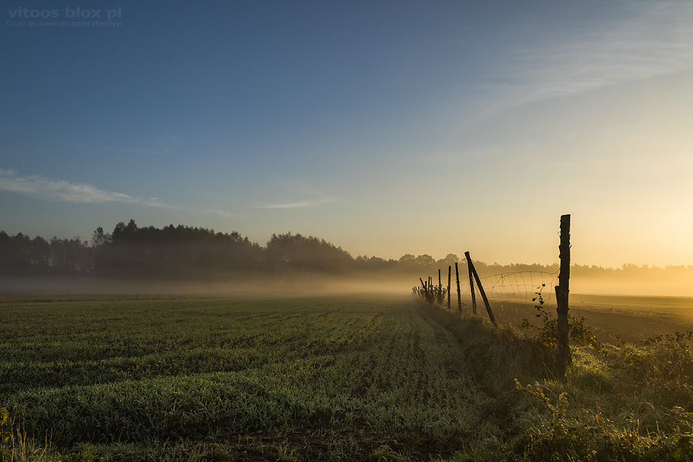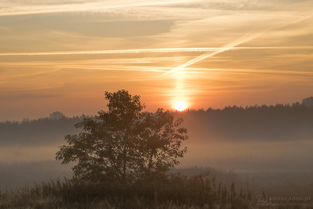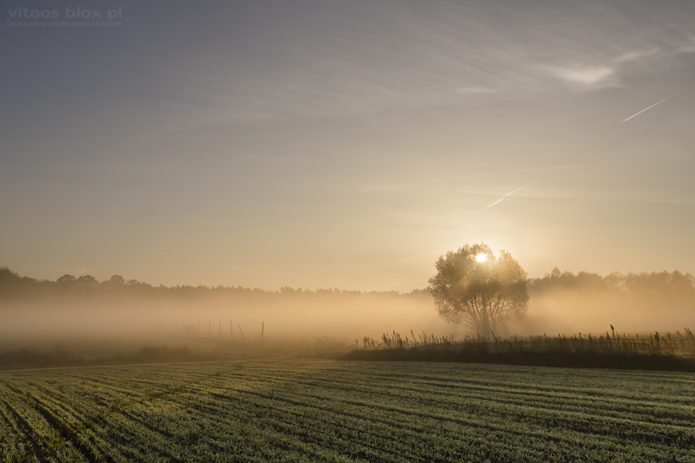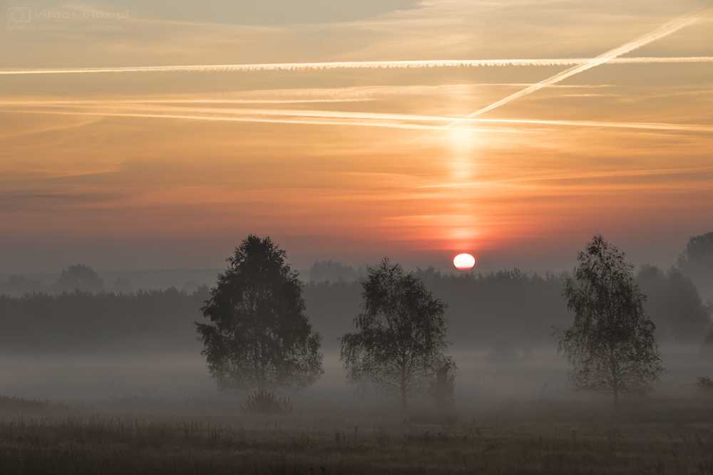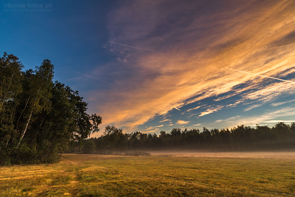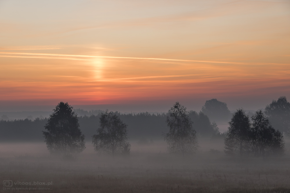 Kiedy nadeszła w końcu upragniona sobota i można by się było w końcu solidnie wyspać, to nie! Wstałem krótko po piątej, na godzinę przed wschodem słońca i pojechałem bez specjalnego plany przed siebie. Po drodze natknąłem się na łąkę, nad którą zalegała mgła i tam postanowiłem poczekać na wschód. Spektakl zaczął się już pół godziny przed wschodem. Nie dość, że niebo przybrało wręcz nierealny kolor, to jeszcze zaczął pojawiać się słup słoneczny.