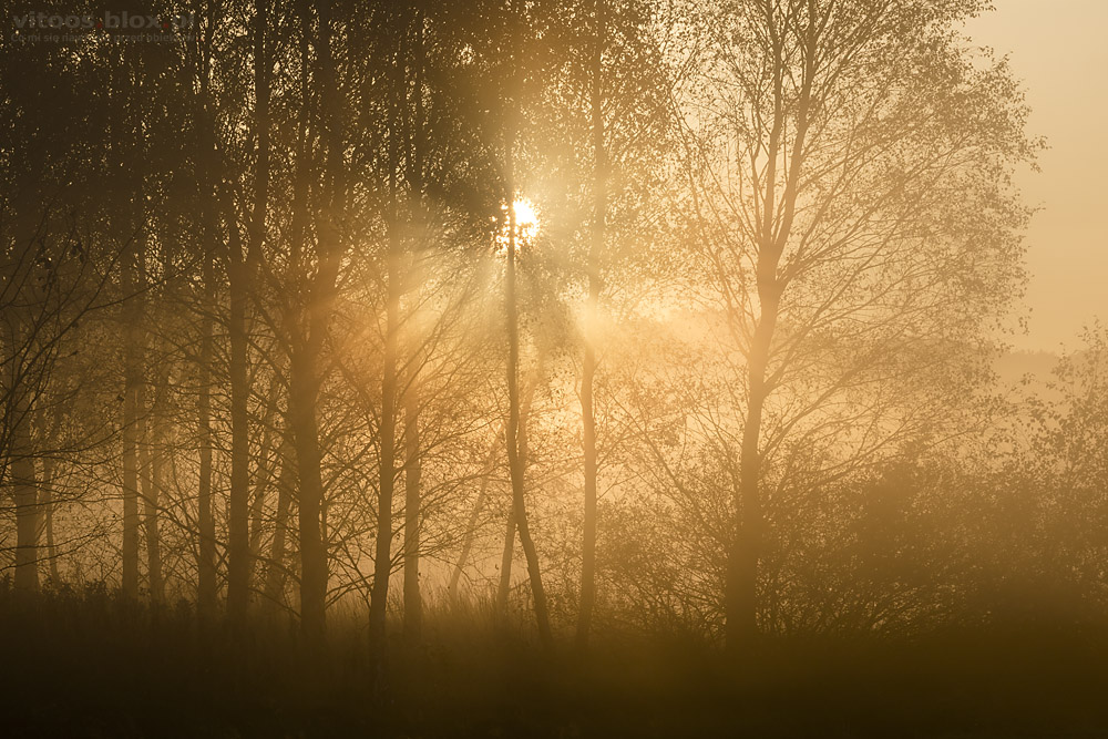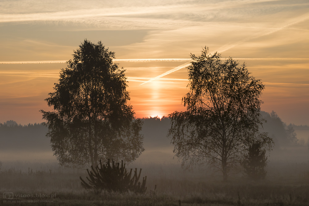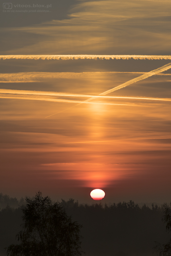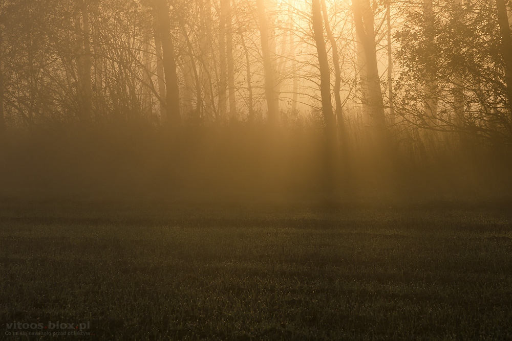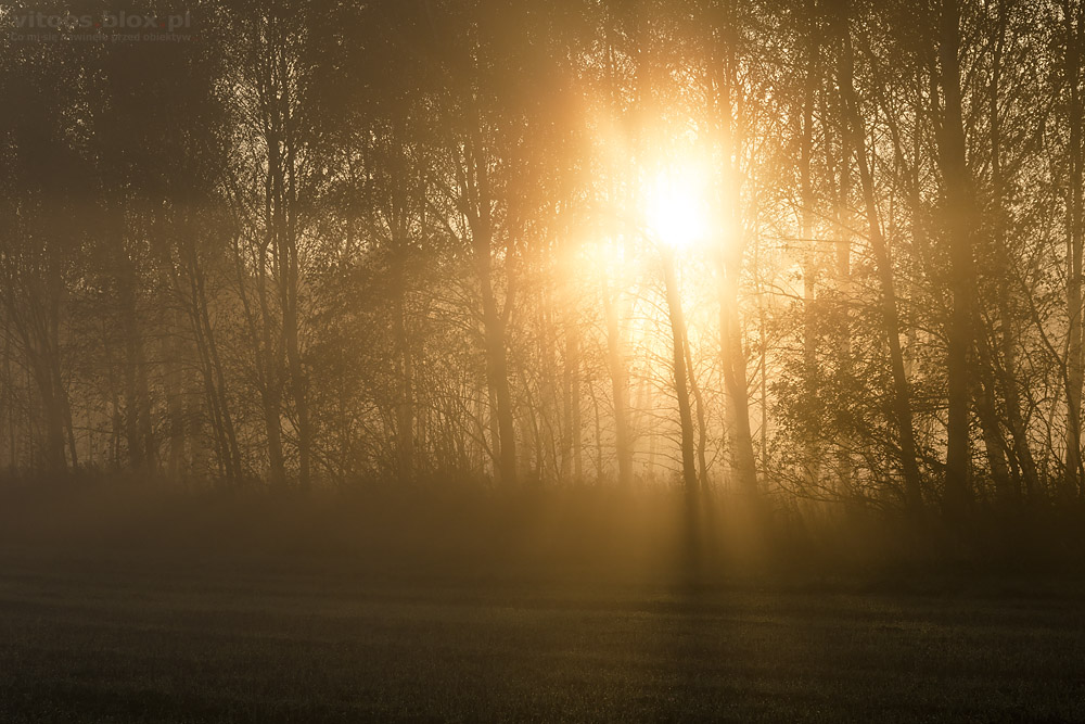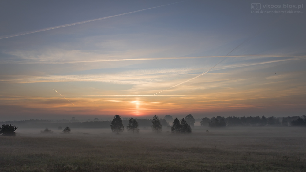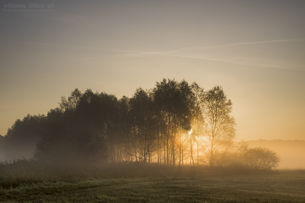 Kiedy nadeszła w końcu upragniona sobota i można by się było w końcu solidnie wyspać, to nie! Wstałem krótko po piątej, na godzinę przed wschodem słońca i pojechałem bez specjalnego plany przed siebie. Po drodze natknąłem się na łąkę, nad którą zalegała mgła i tam postanowiłem poczekać na wschód. Spektakl zaczął się już pół godziny przed wschodem. Nie dość, że niebo przybrało wręcz nierealny kolor, to jeszcze zaczął pojawiać się słup słoneczny.