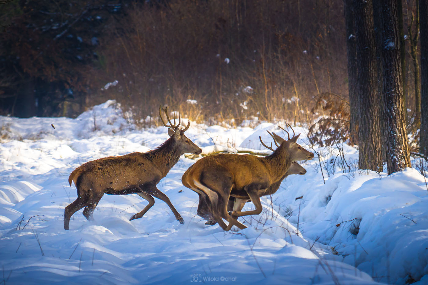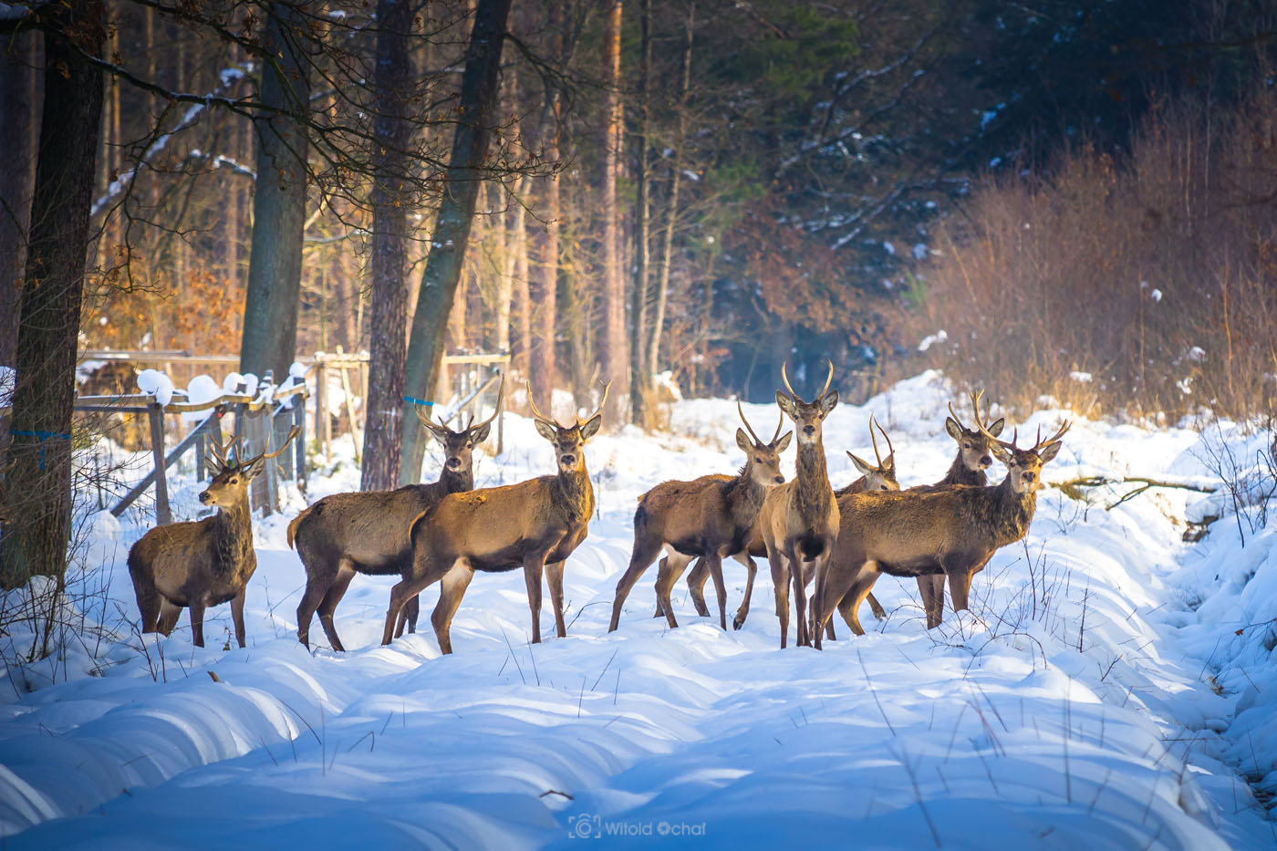 FOT. WITOLD OCHAŁ POWIAT ROPCZYCKO-SĘDZISZOWSKI FOTOGRAFIA KRAJOBRAZOWA KRZYWA PODKARPACIE JELEŃ ŁANIA STADO ŁĄŃ ZIMA SNIEG LAS
