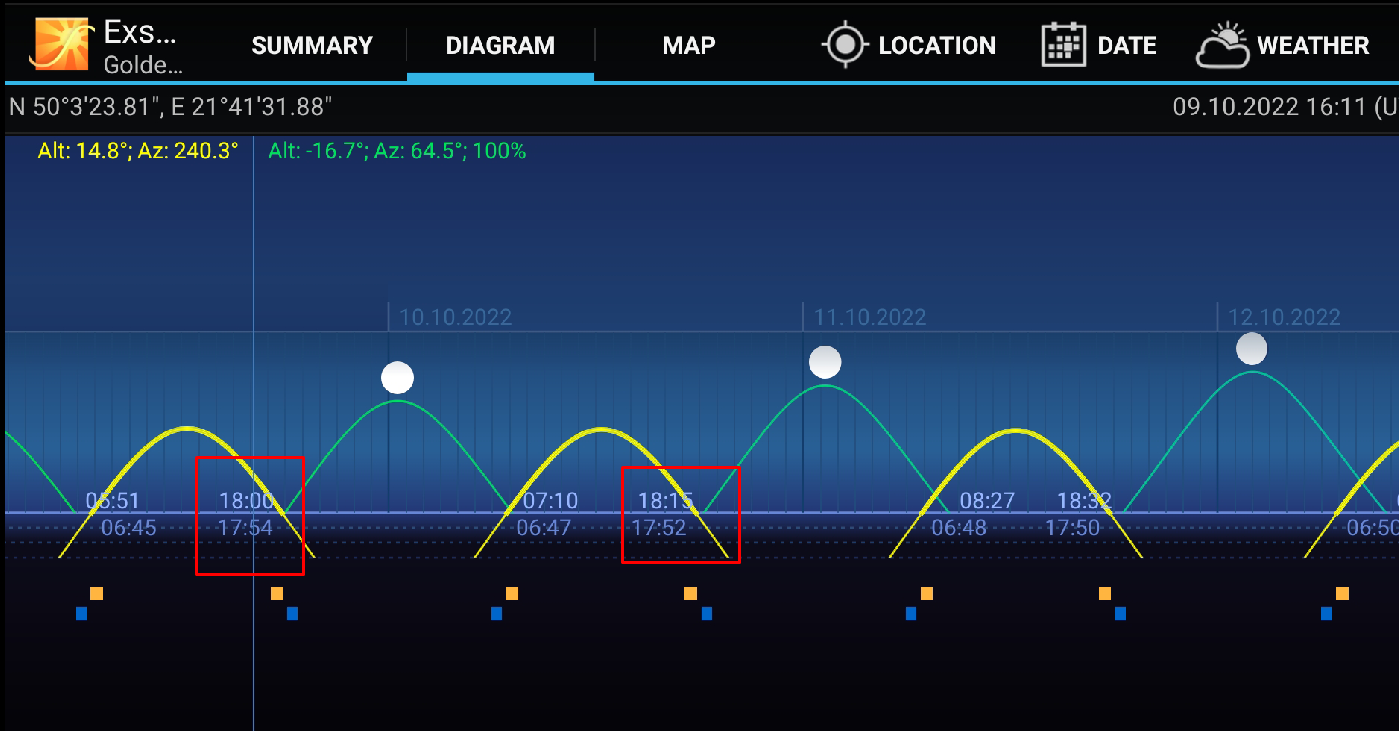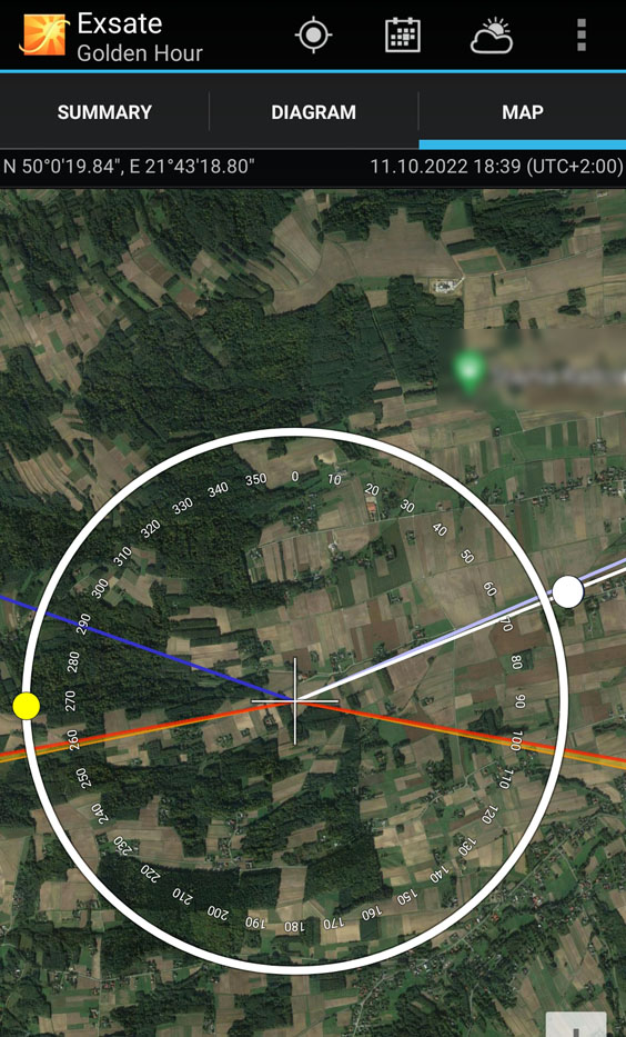 Kiedy już wypatrzę jakieś samotne drzewo, ładnie wystający nad horyzont kościół, lub jakikolwiek inny element krajobrazu, długą prosto ciągnącą się drogę, wiadukt, co tylko wegług mnie będzie ładnie komponowało się z księżycem, zaznaczam miejsce (z którego zrobiłem tę obserwację) na mapach. Następnie korzystając z aplikacji Exsate Golden Hour (może być inna, takich aplikacji jest sporo) sprawdzam, kiedy księżyc wschodzi lub zachodzi za znalezionym obiektem. Notuję datę, bo może to być dopiero za kilka miesięcy i ustawiam dzień wcześniej przypomnienie.