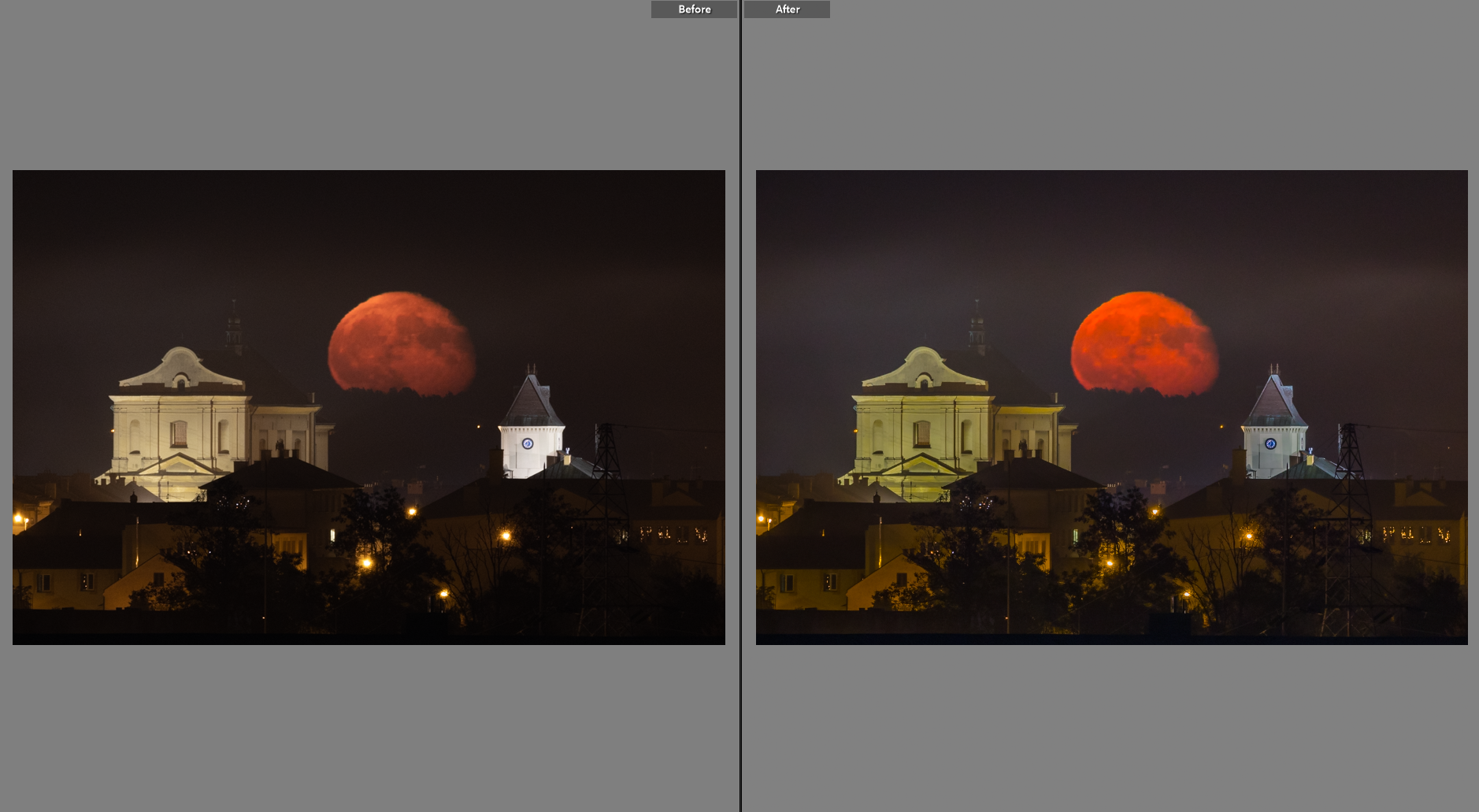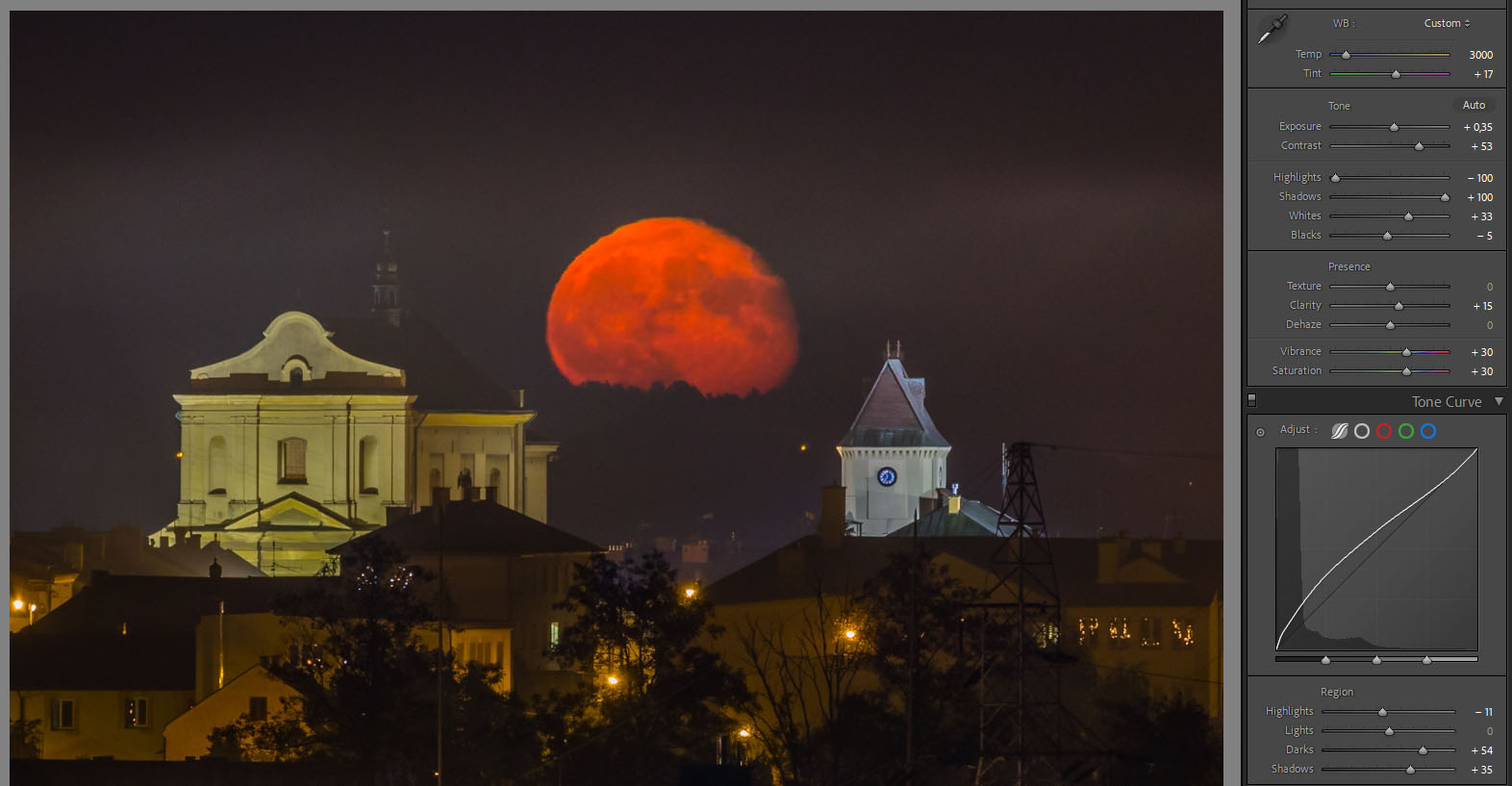 W przypadku fotografowania wschodu czy zachodu księżyca proponuję zawsze zapisywać zdjęcia w formacie RAW i potem poddać je samodzielnej postprodukcji. W trudnych warunkach, kiedy jest już nieco ciemno więcej informacji odzyskamy z tego formatu niż ze zwykłego jpg. Ja swoje zdjęcia obrabiam w Lightroomie.