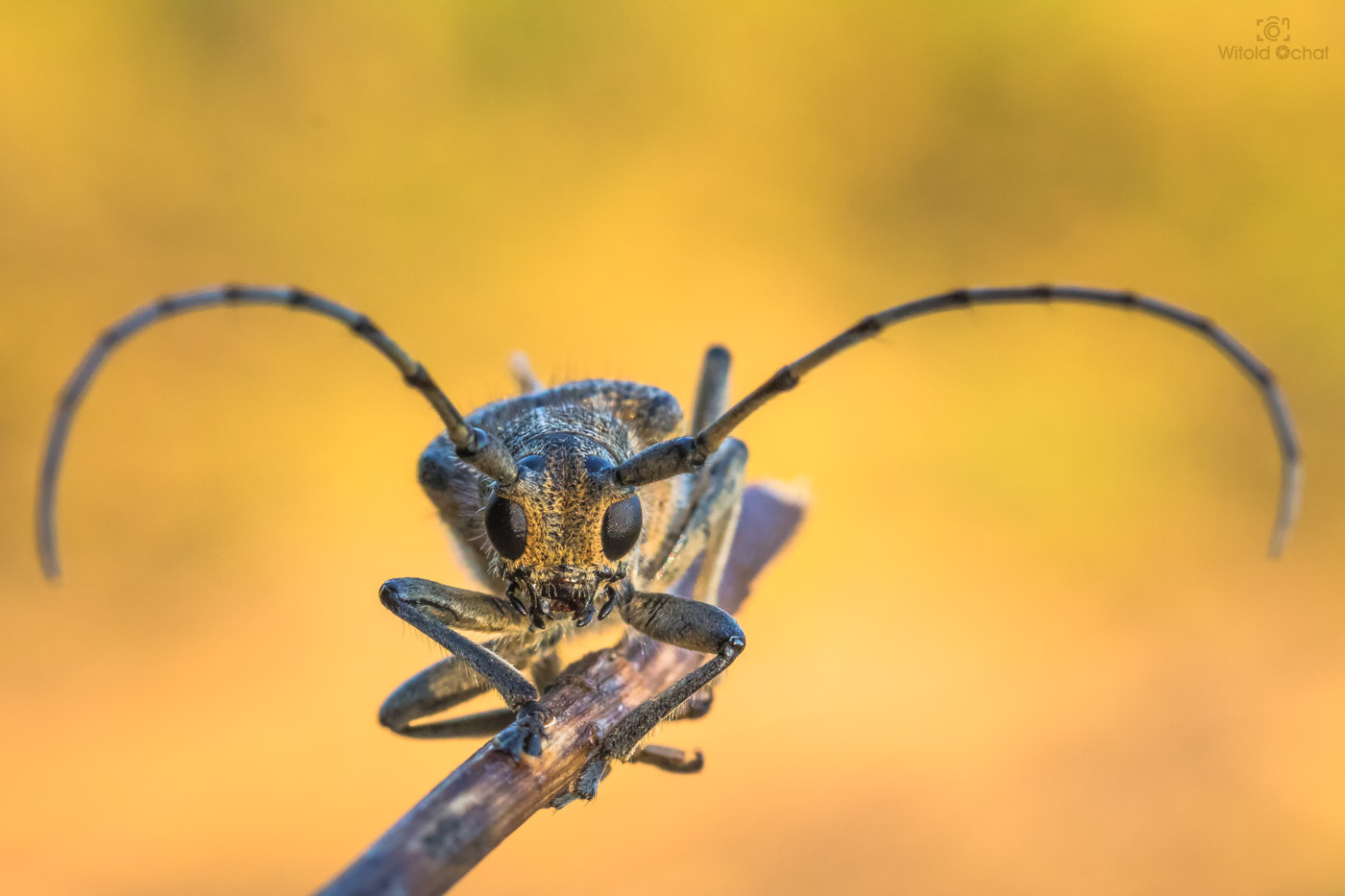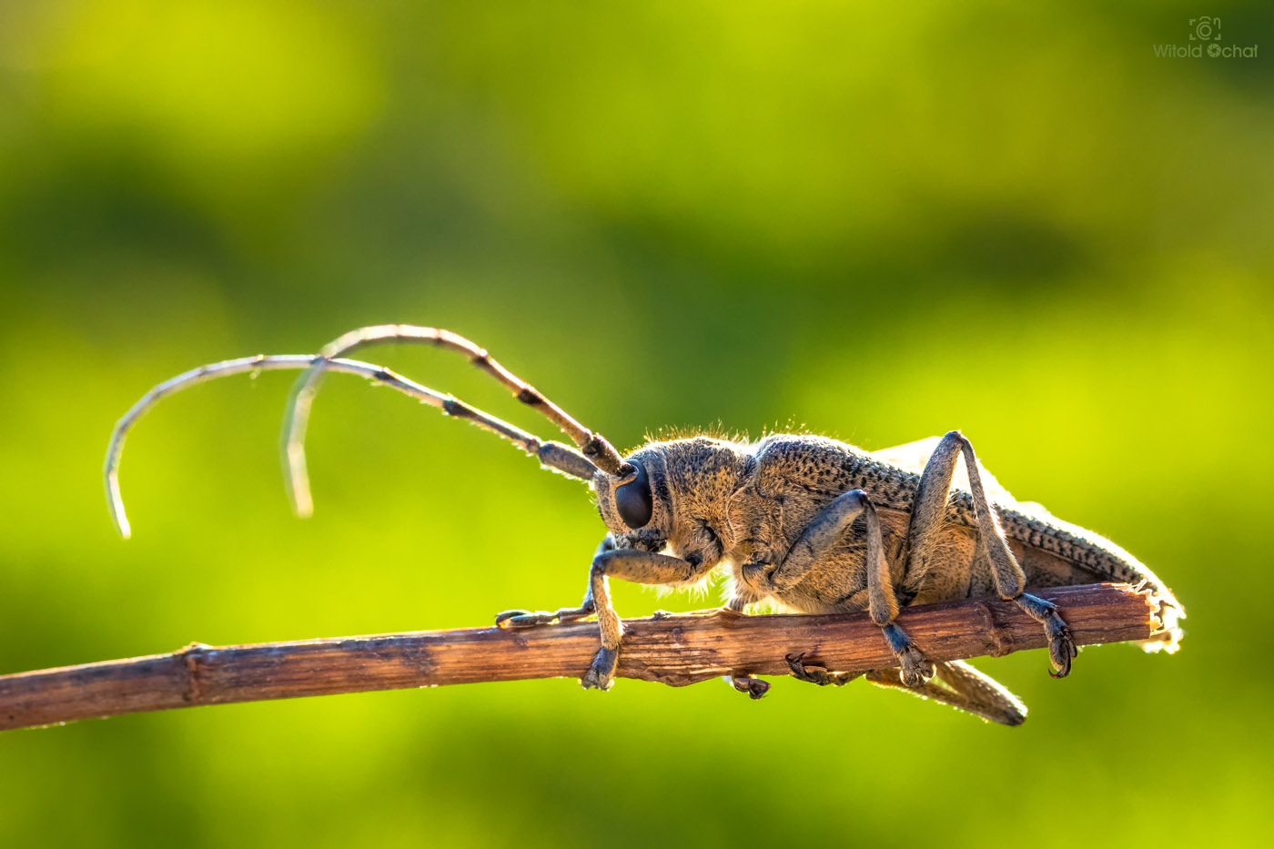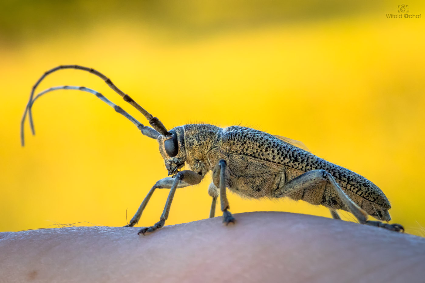 Ciepłe i słoneczne wieczory wrześniowe kilkakrotnie spędzałem na okolicznych łąkach w poszukiwaniu owadów. Jeden z nich sam do mnie przyleciał. Potężny chrząszcz długości aż około trzech centymetrów wylądował na mojej koszulce i był niezwykle chętny do pozowania. To Rzemlik topolowiec (Saperda carcharias).