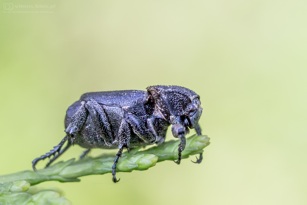 – Może urodą nie grzeszę, ale z pewnością jestem jakimś rzadkim okazem, bo jeden taki, co to fotografuje owady, to spotkał mnie pierwszy raz w swoim życiu – przechwalał się wątpliwej urody chrząszcz, którego spotkałem w drugiej połowie maja. To mocno wytarty Krzywonóg półskrzydlak (Valgus hemipterus).