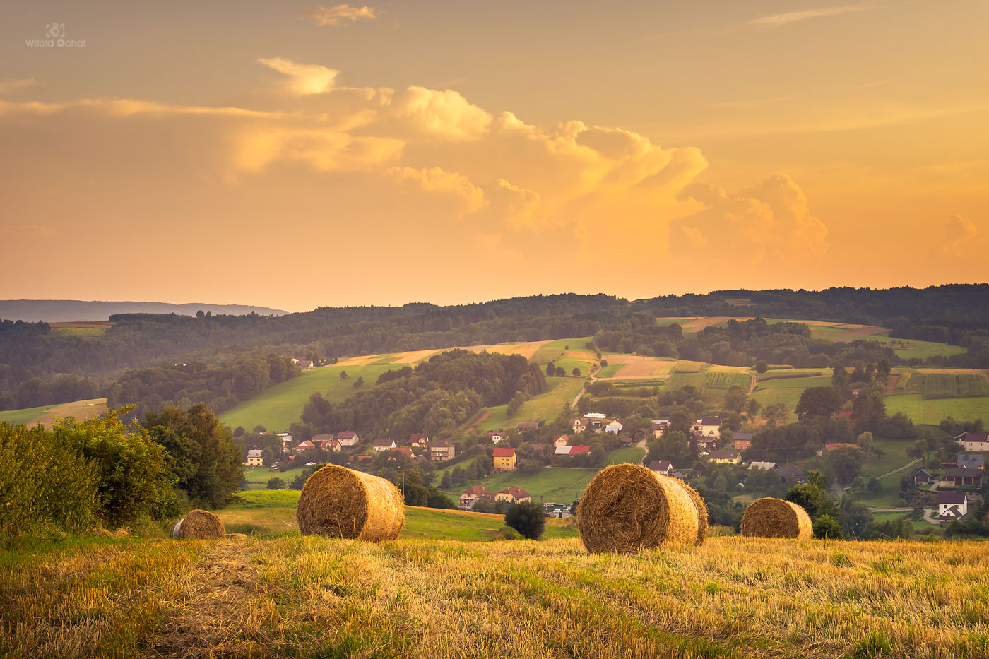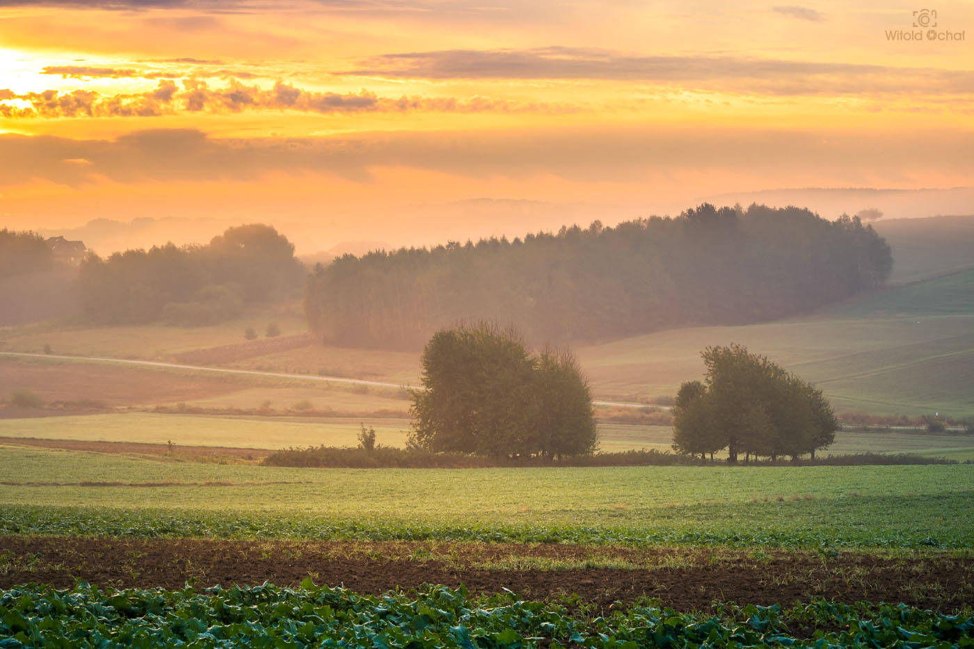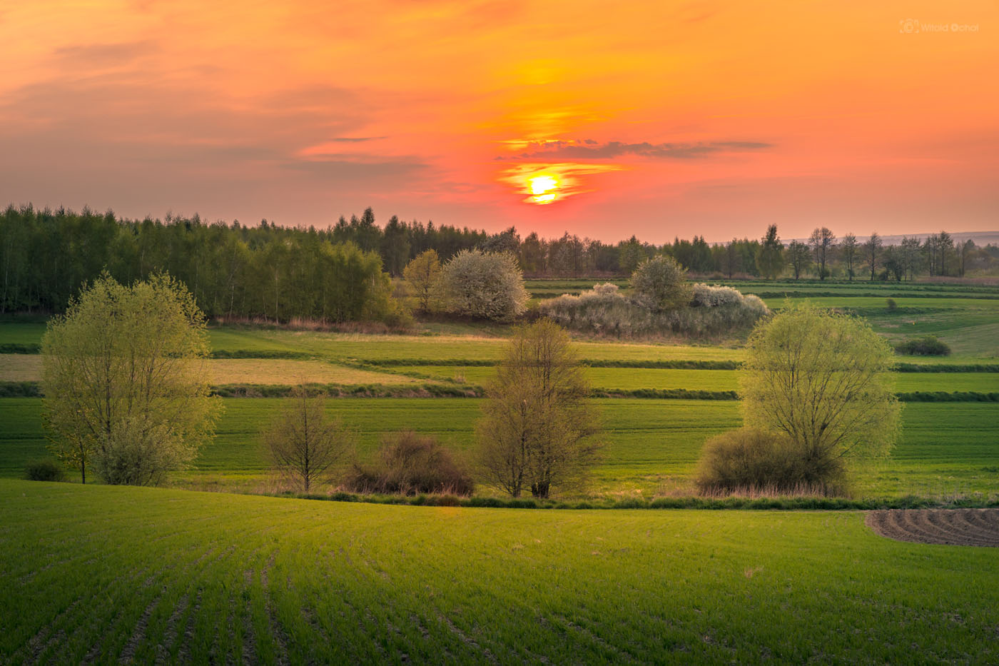 Lubię fotografować w tym miejscu. Pagórki u nas co prawda są, ale niezbyt wysokie i większość z roku na rok coraz bardziej porośnięta lasami. A tutaj widoczna jest urokliwa, choć niezbyt rozległa dolinka, gdzie zostały pola uprawne i poza tym nie ma żadnych widocznych śladów cywilizacji. Mowa o zabudowaniach i wszechobecnych liniach energetycznych.