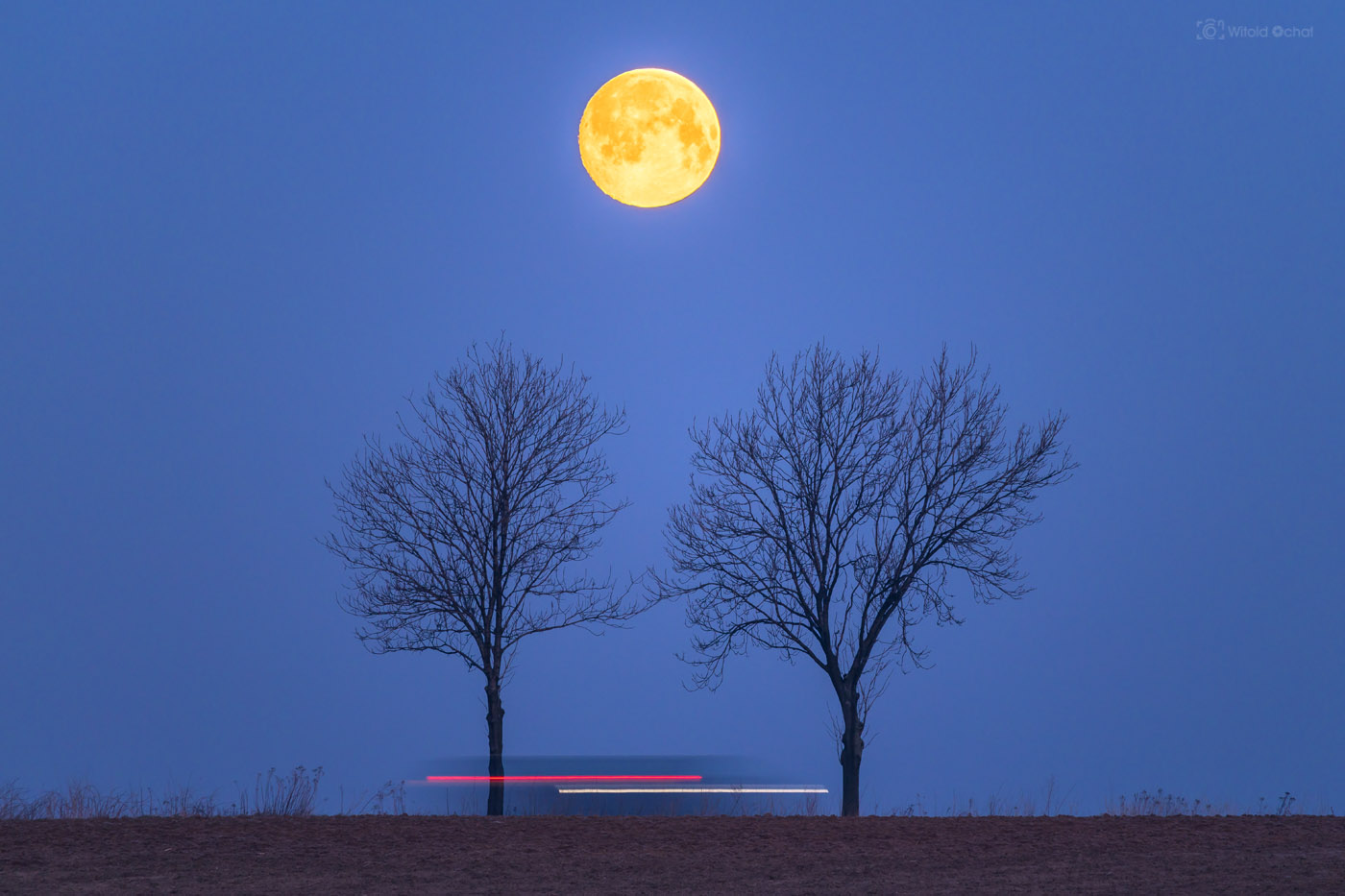 Wybrałem miejsce oddalone o jakieś czterysta metrów od szczytu pagórka, którym biegnie droga i rośnie kilka niewielkich drzew. Na pierwszej fotce udało się złapać światła przejeżdżającego samochodu, co chyba fajnie urozmaiciło kadr. Kolejne fotki za innymi drzewami robiłem chwilę później, kiedy Księżyc był już niżej.