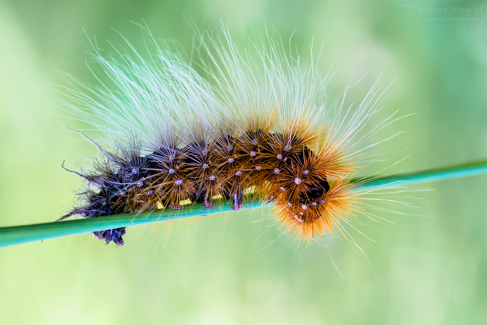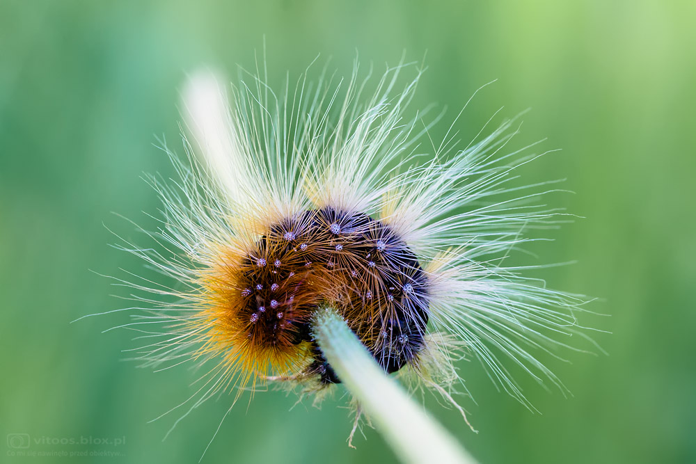 Na dzisiejszych zdjęciach niezwykle włochata gąsienica, którą znalazłem w ogrodzie. Niestety coś stało się z jej fryzurą, bo na tylnej części miała skołtunione włosy