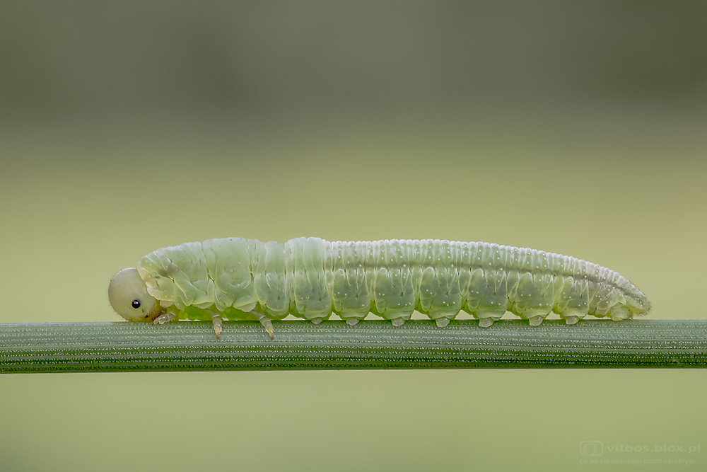 Spacerowałem skrajem świeżo skoszonej łąki, mając nadzieję na miedzy znaleźć jakieś owady do sfotografowania. Tymczasem na owej skoszonej i lekko podeschniętej trawie zauważyłem tę ogromną gąsienicę. To barczatka napójka. Niestety spotykam tylko jej gąsienice, ćmy do tej pory nie udało mi się sfotografować