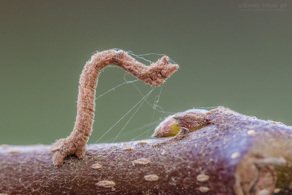 Tę gąsieniczkę zauważyłem na gałązce jabłonki. Oczywiście w pierwszej chwili nie załapałem, że to żywe stworzenie, a nie odnoga gałązki. Kiedy zacząłem poruszać gałęzią gąsienica podniosła łebek do góry i chyba próbowała mnie odstraszyć.