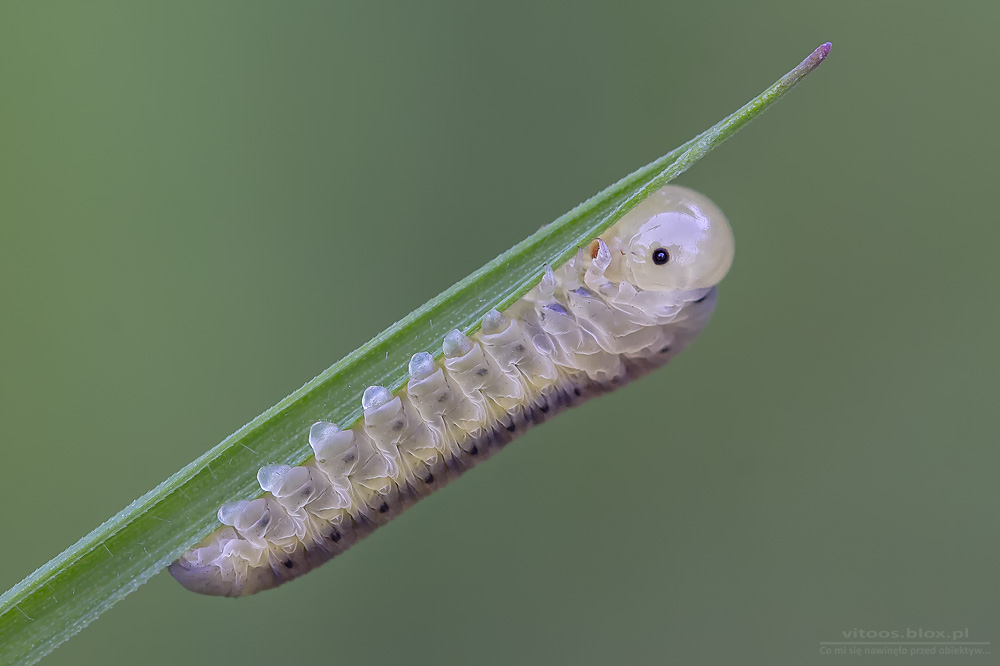Niedaleko od siebie siedziały sobie dwie larwy błonkówek, jedna jeszcze całkiem zielona, druga zdążyła już dojrzeć.