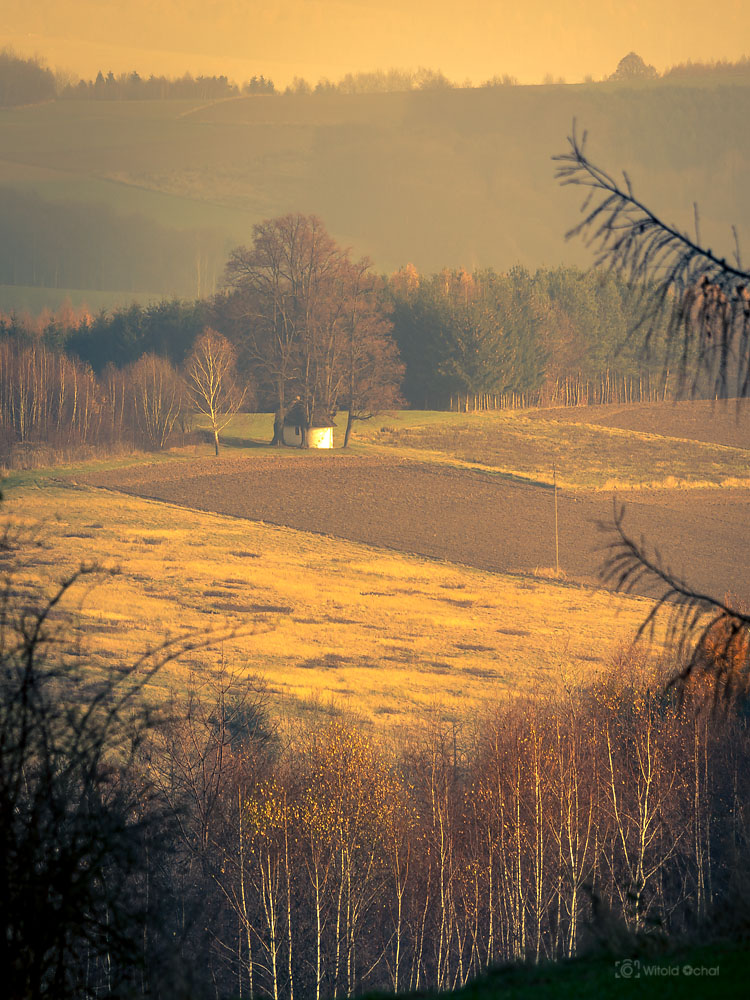 Wybór padł na okolicę, którą pamiętałem z ubiegłego roku, a z której roztaczał się widok na sąsiednie wzgórze z urokliwą kapliczką, wnoszącą się ni stąd ni zowąd w szczerym polu. Udało się trafić i na tę miejscówkę i na nienajgorsze jak na tę porę roku światło.