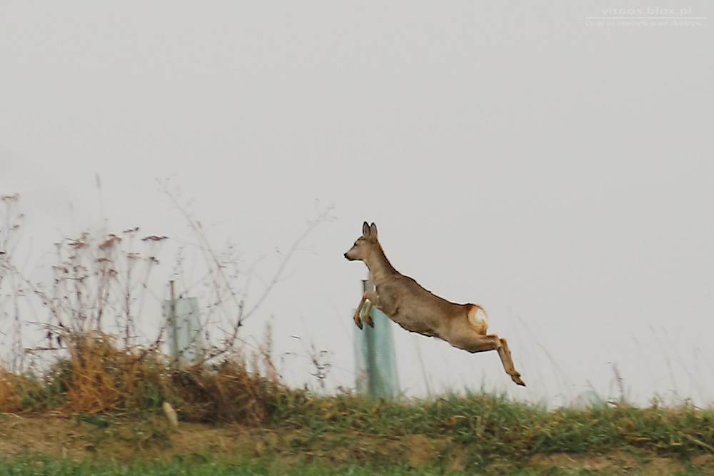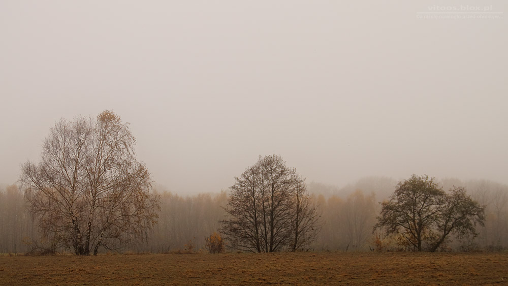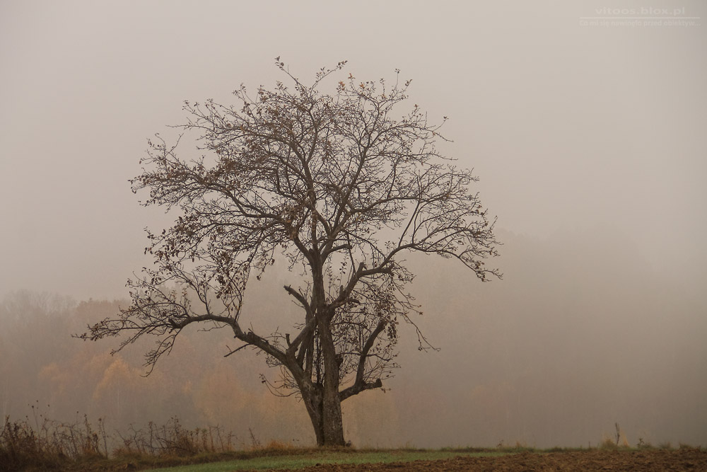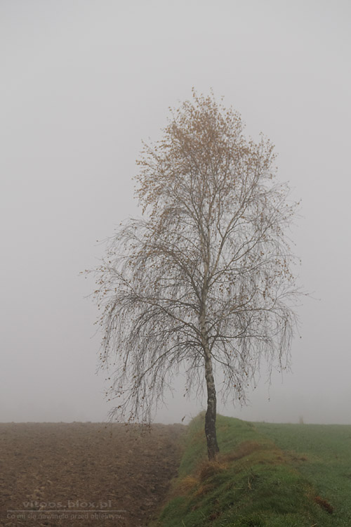 Nie wszędzie mgła była bardzo gęsta, jak na wczorajszych zdjęciach. Natknąłem się na jedno całkiem jeszcze zielone drzewo… A na koniec spotkałem sarenkę, która postanowiła poćwiczyć skoki przez płotki.