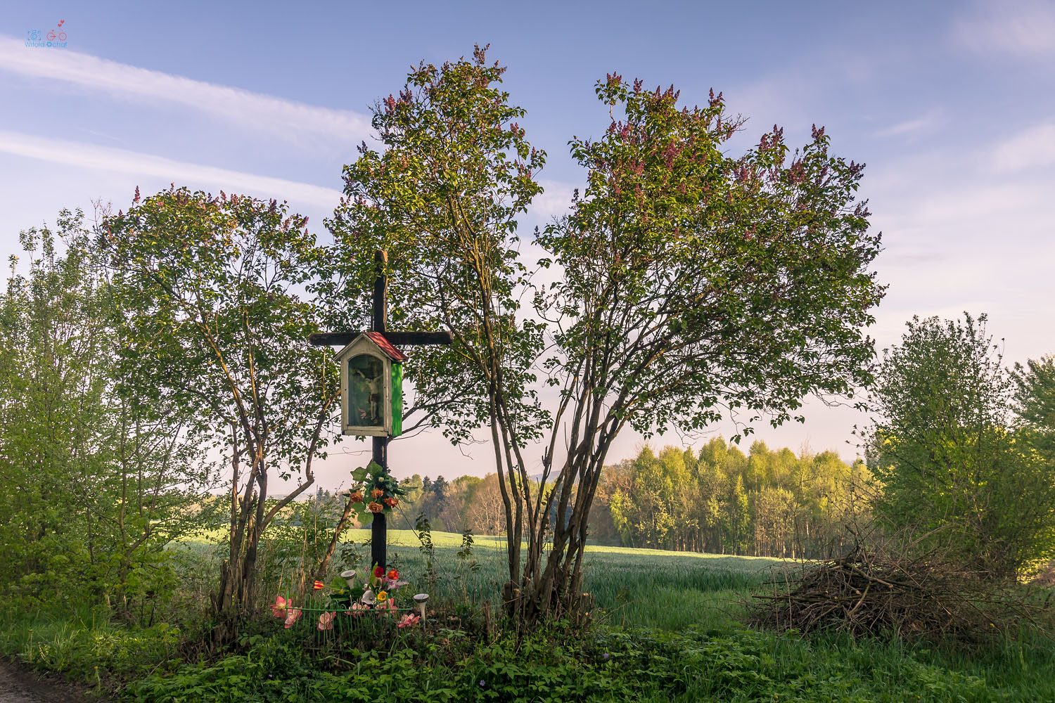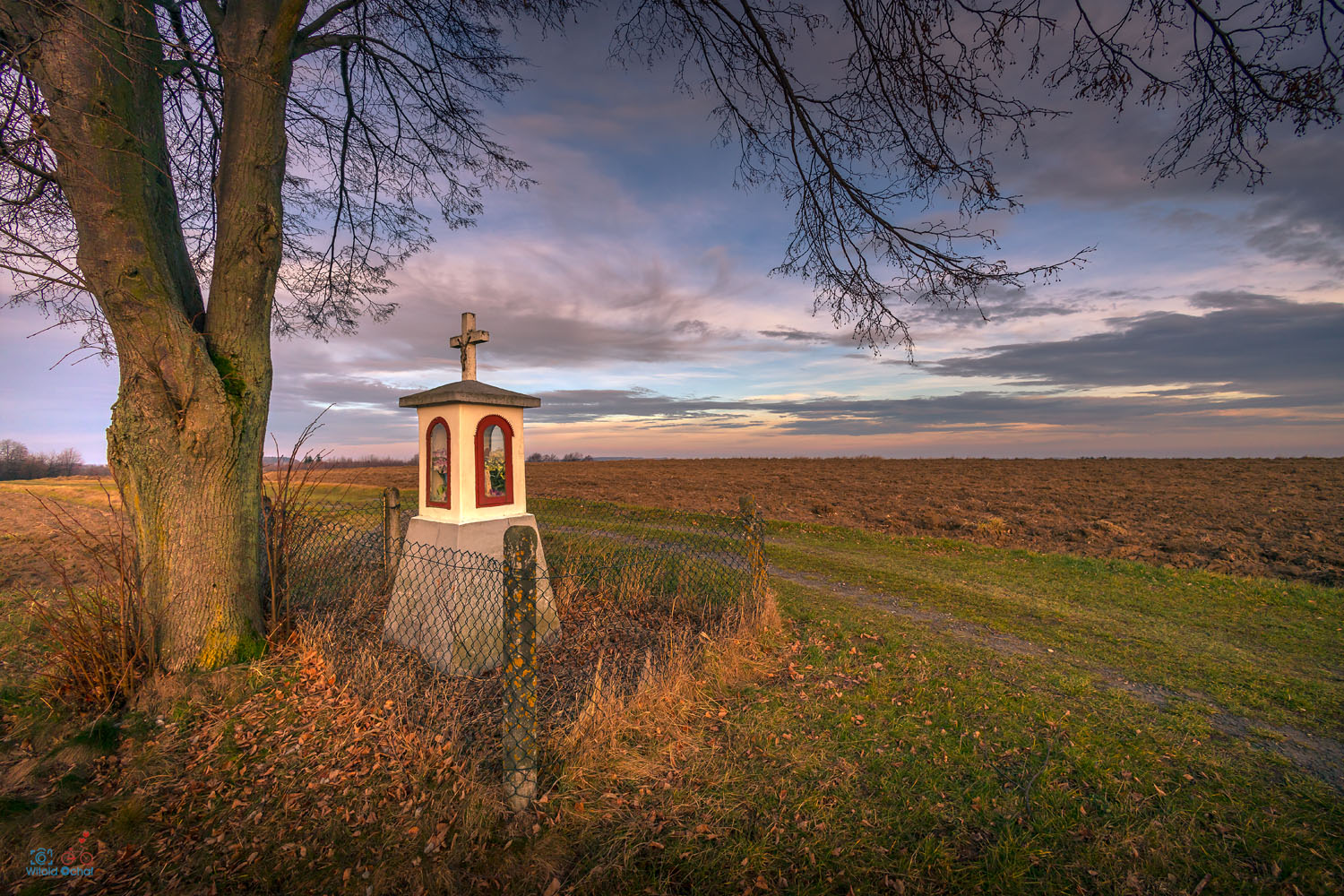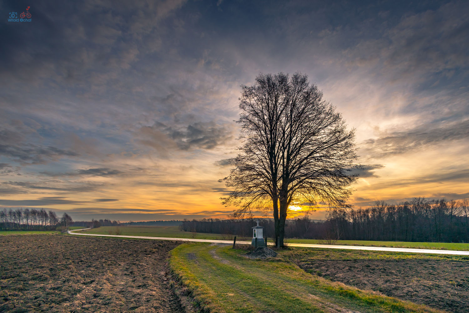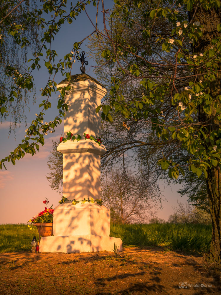 Kilka kilometrów ode mnie ciągnie się szczytem wzgórza wąska, mało uczęszczana asfaltowa droga – częsty cel moich fotograficznych i rowerowych wycieczek. Znajduje się tam poniższa kapliczka pod lipą, a oprócz tego kolejna i metalowy krzyż oraz trzy urokliwe małe kapliczki na starych drzewach. Wszystkie te sześć miejsc bardzo lubię i często je fotografuję.