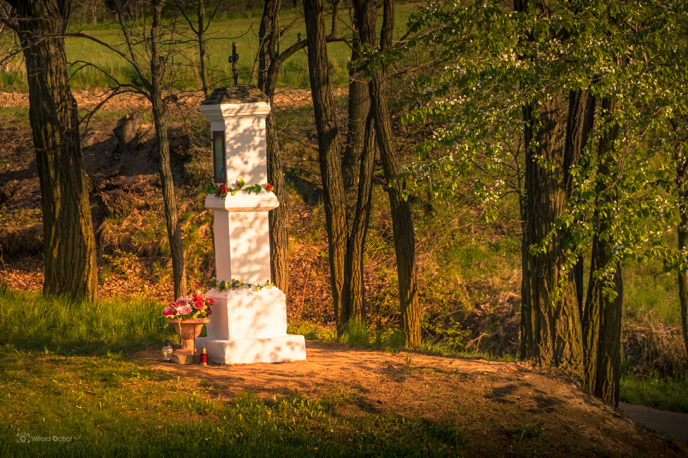 Ale wczoraj w końcu mnie olśniło. Albo wieczorne światło olśniło kapliczkę. Spodobały mi się te ciepłe barwy, cienie liści na kapliczce i tych kilka gałązek dzikiej wiśni z kwitnącymi kwiatkami.