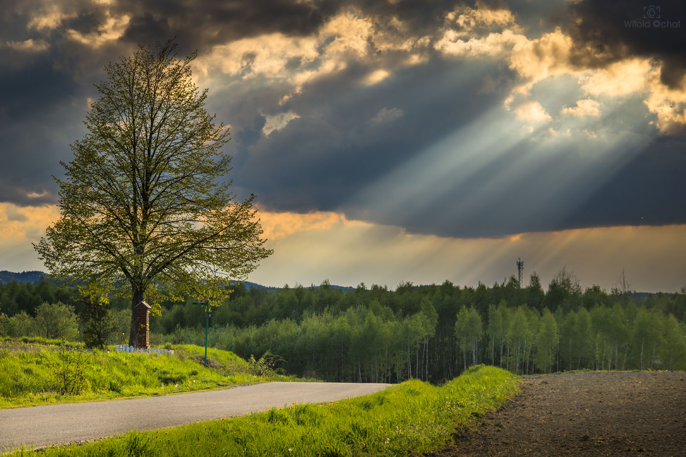 FOT. WITOLD OCHAŁ POWIAT STRZYŻOWSKI FOTOGRAFIA KRAJOBRAZOWA PODKARPACIE SZUFNAROWA PROMIENIE NA NIEBIE CHMURY DZIURAWA CHMURA KAPLICZKA SAMOTNE DRZEWO DROGA