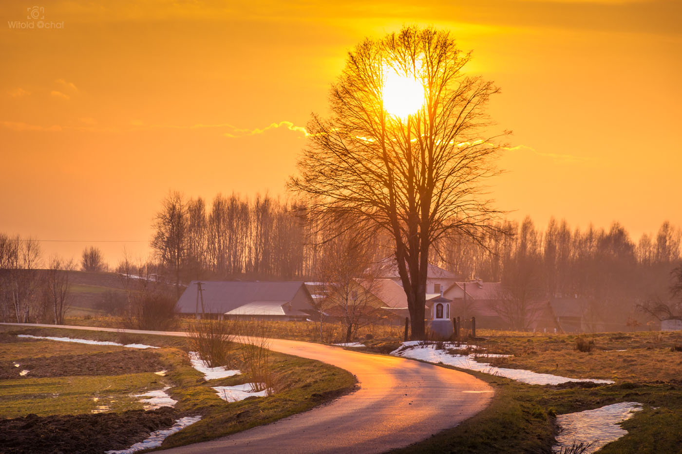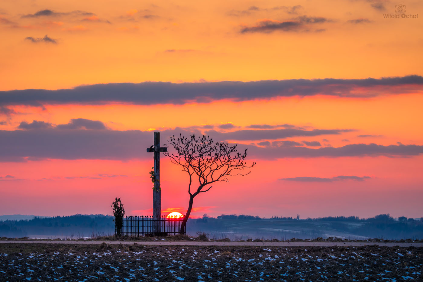 Na szczycie jednej z okolicznych górek, tuż przy drodze stoi krzyż. I byłby to zwykły przydrożny krzyż, jakich wiele, gdyby nie drzewko o wymownym kształcie rosnące tuż obok niego. Fajnie, że to takie drzewko, a nie na przykład wszechobecne tuje (choć jakaś mała tam po lewej widzę sobie rośnie. Mam cichą nadzieję, że tujka albo uschnie, albo zmarznie, a drzewko zostanie. Często przejeżdżając tamtędy zatrzymuję się, by zrobić zdjęcie i tak było kilka dni temu, kiedy dodatkowo udało mi się umieścić w kadrze kulkę zachodzącego słońca.