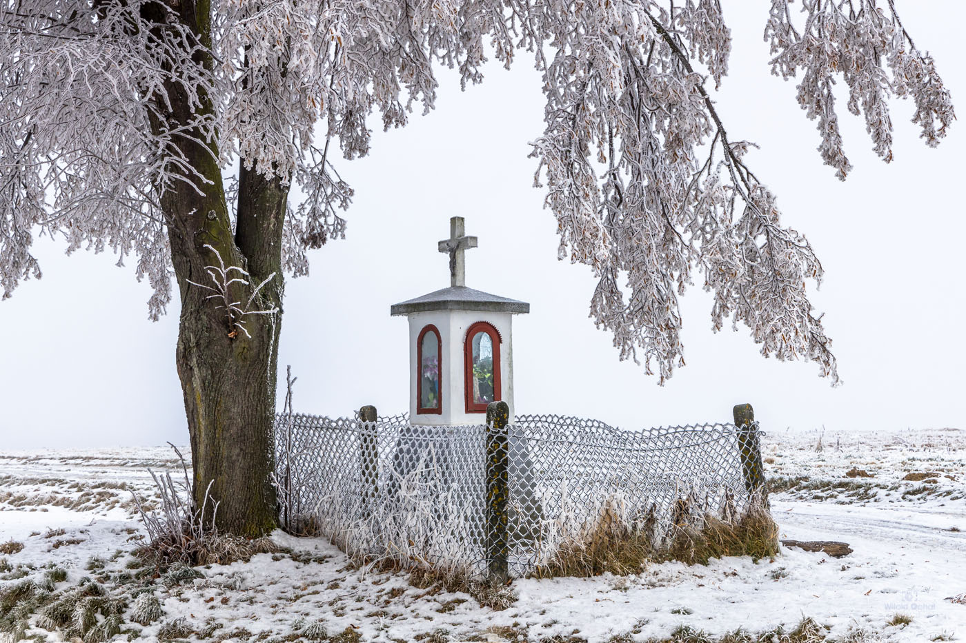 FOT. WITOLD OCHAŁ POWIAT ROPCZYCKO-SĘDZISZOWSKI FOTOGRAFIA KRAJOBRAZOWA SZKODNA SZADŹ KAPLICZKA POD DRZEWEM ZIMA MRÓZ ŚNIEG