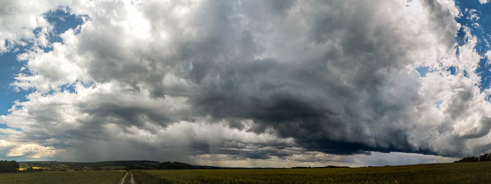 W ciągu ostatniego czasu miałem okazję obserwować i fotografować kilka kowadeł komórek burzowych znajdujących się daleko ode mnie. Absolutny rekord padł dokładnie tydzień temu. Centrum tej komórki burzowej znajdowało się około 350 kilometrów ode mnie, w okolicy Bratysławy. Brzeg kowadła 150 – 250 kilometrów. Nie do uwierzenia jaki to był kolos.