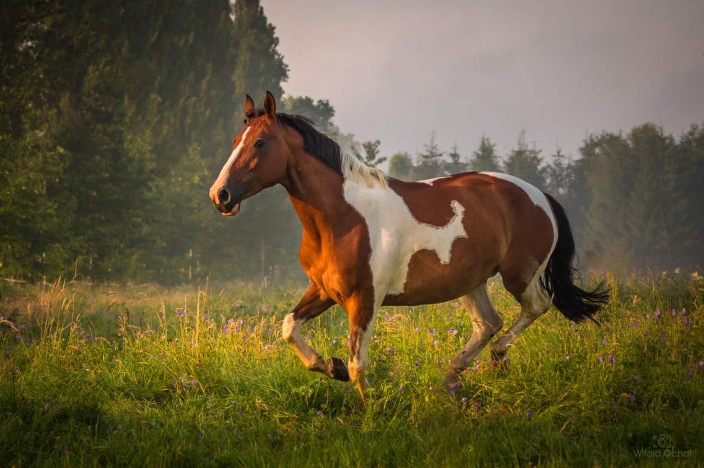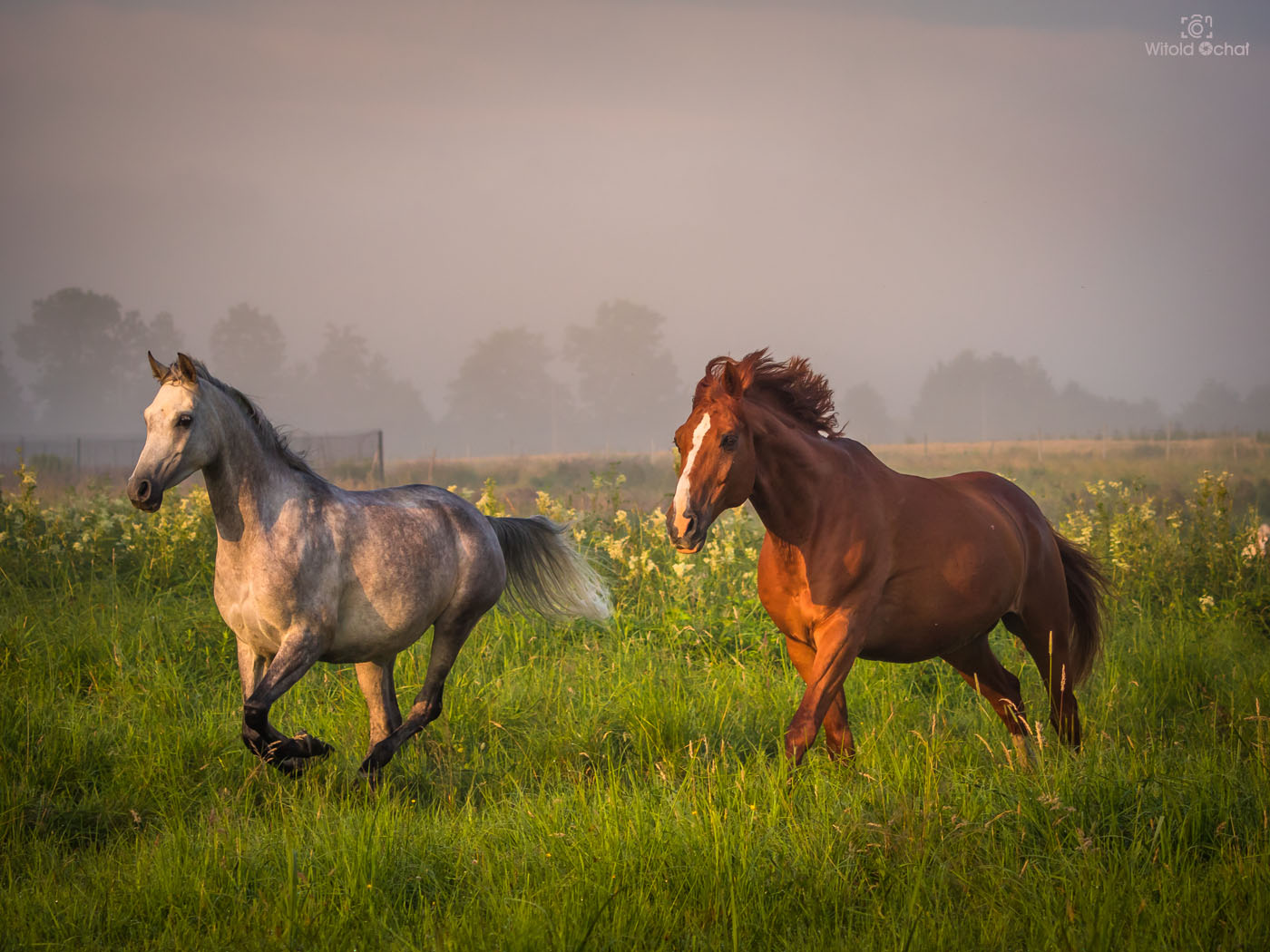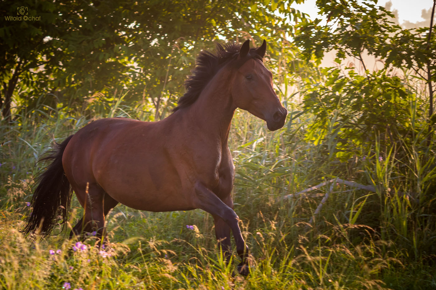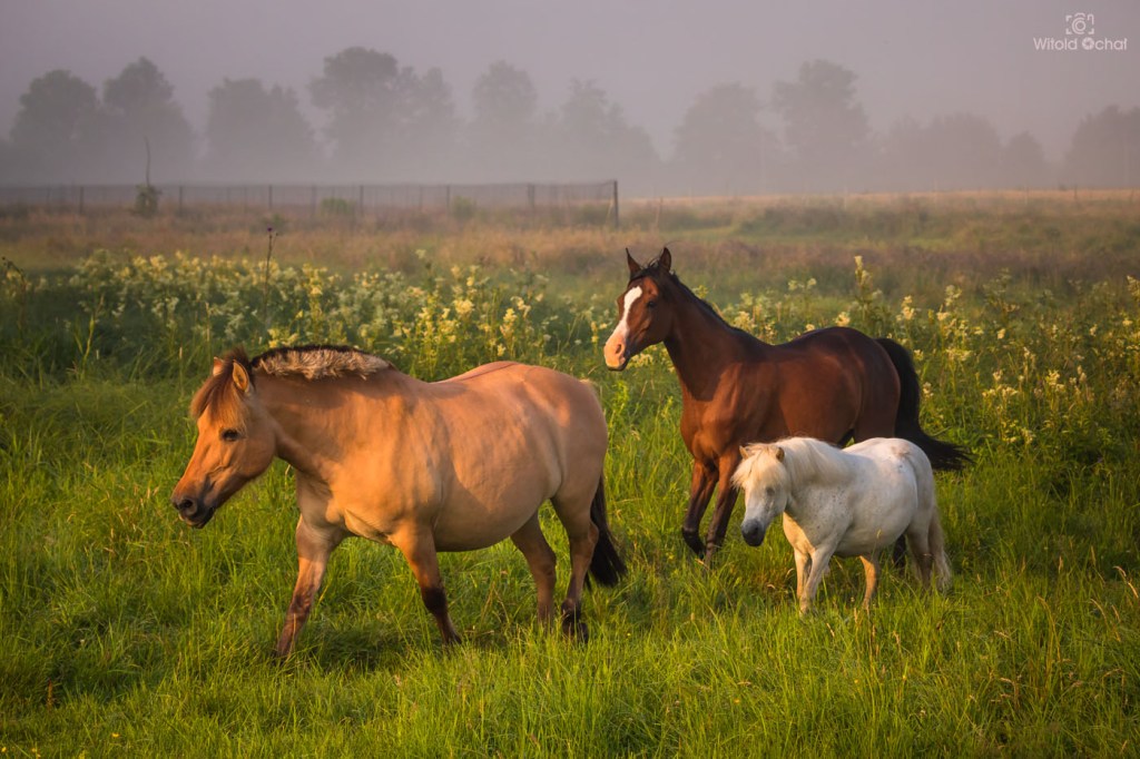 Jechałem rowerem pod solidną górkę, gdy zza zakrętu wypadło dwa konie ze źrebakiem, które prowadziły ze sobą swojego pana i zapewne jego córkę. Zwiewałem w rów szybciej niż ustawa przewiduje, jednocześnie wyrywając z sakwy aparat. Zanim doszedł mnie powiew wiatru za nimi, już pstrykałem fotkę.
